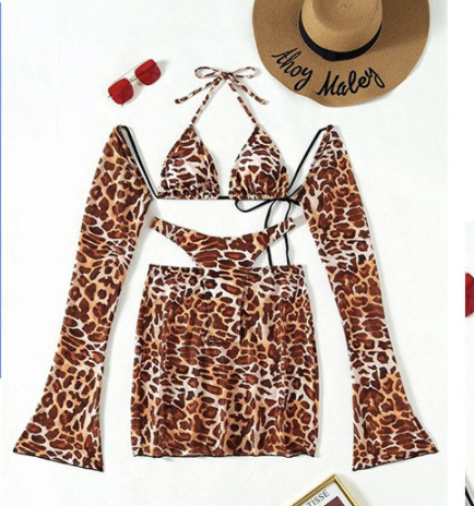 2023 comercio exterior transfronterizo estampado de leopardo europeo y americano sexy bikini dividido de tres piezas traje de baño de mujer fabricante lote de moda