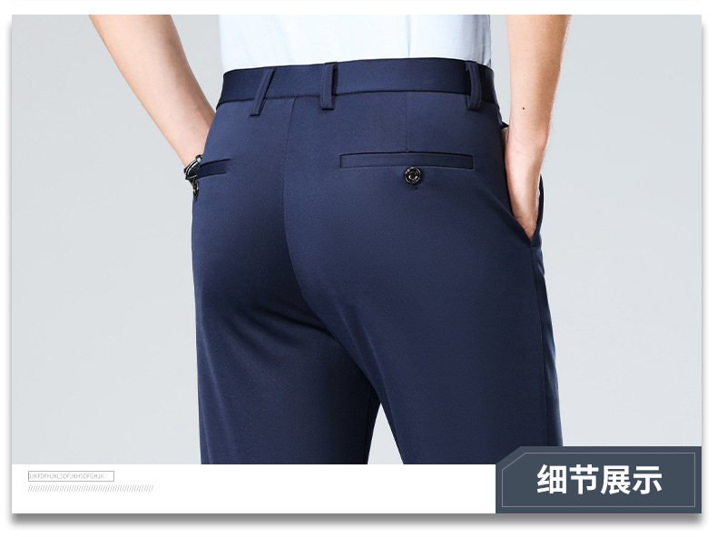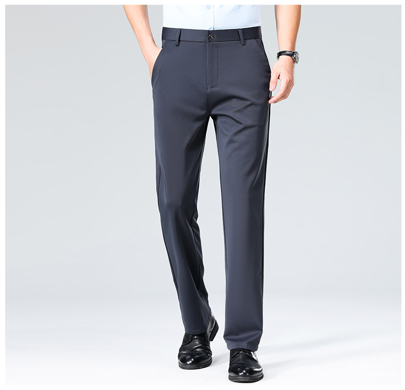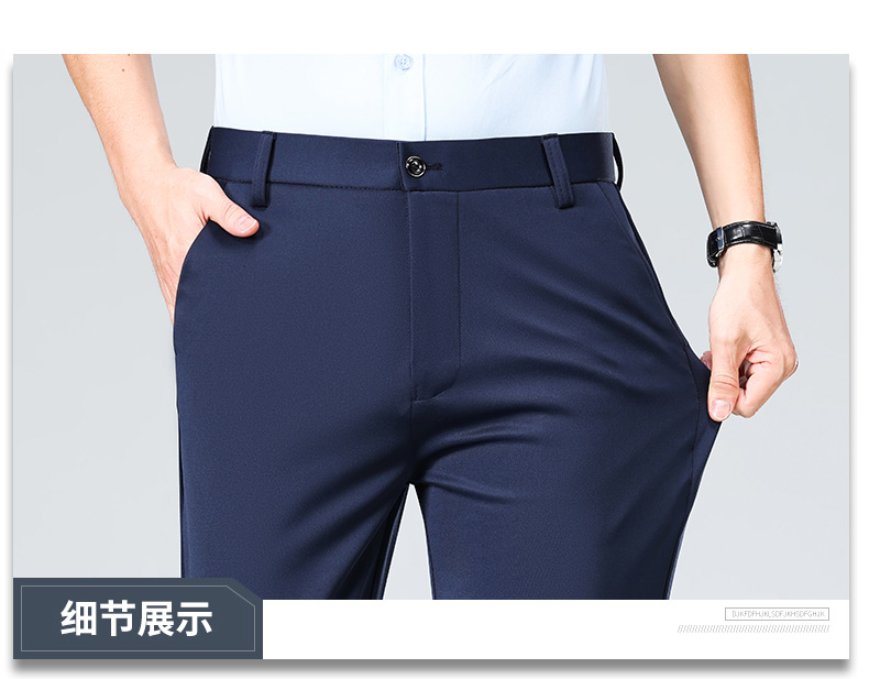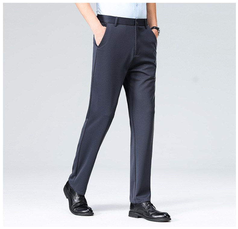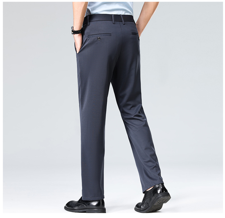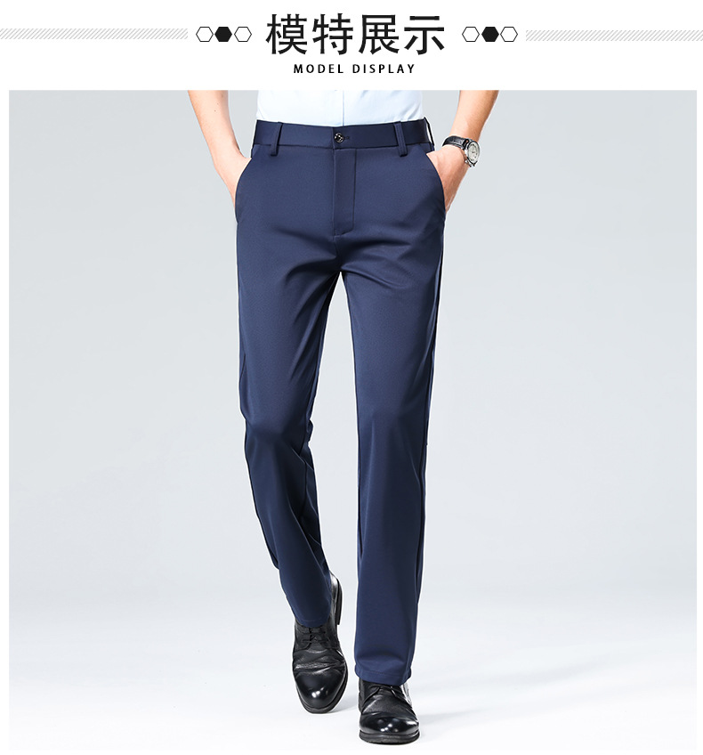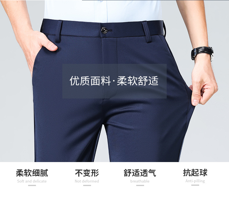 Suministro directo de fábrica, pantalones casuales para hombres elásticos de cuatro caras sin planchar, pantalones de negocios rectos delgados de seda de hielo de verano para hombres