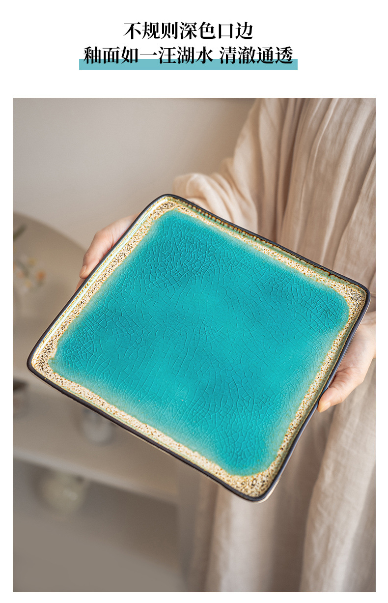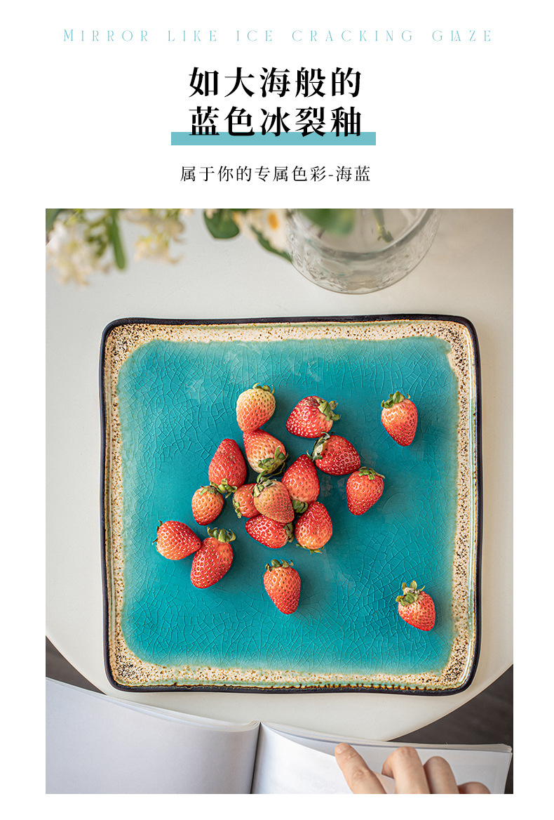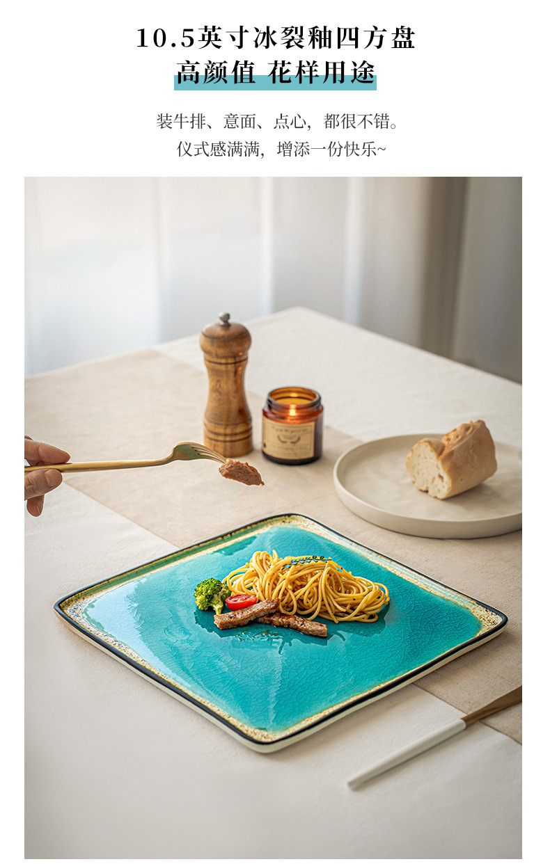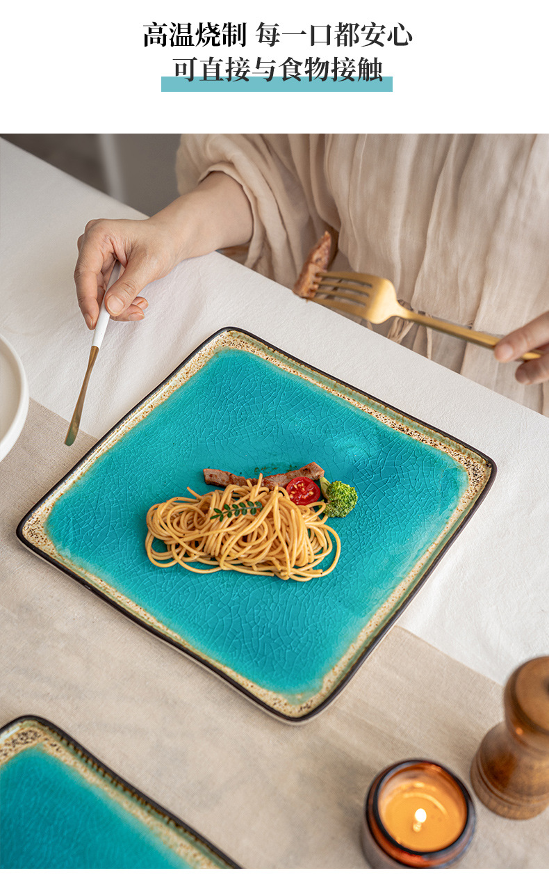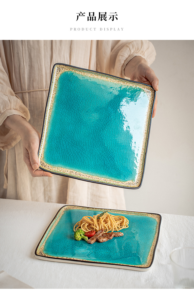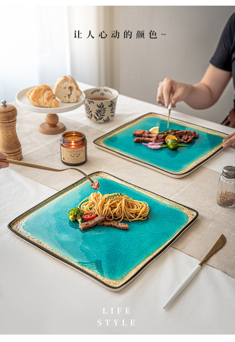 Plato azul marino de alto valor, plato cuadrado de cerámica, plato de platos caseros, plato de filete, exportación transfronteriza de cubiertos esmaltados por hielo