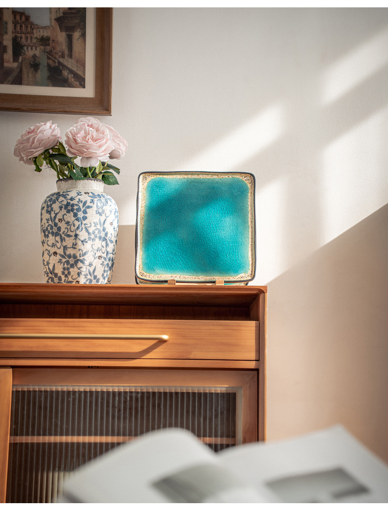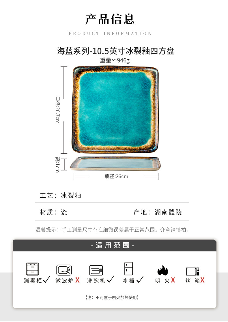 | Color | Serie azul marino - disco cuadrado de esmalte agrietado en hielo de 10,5 pulgadas |