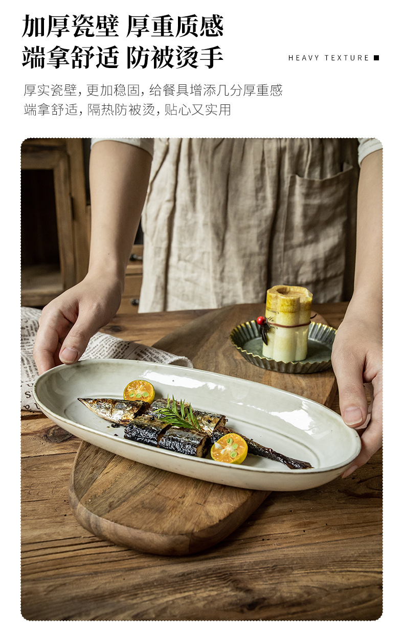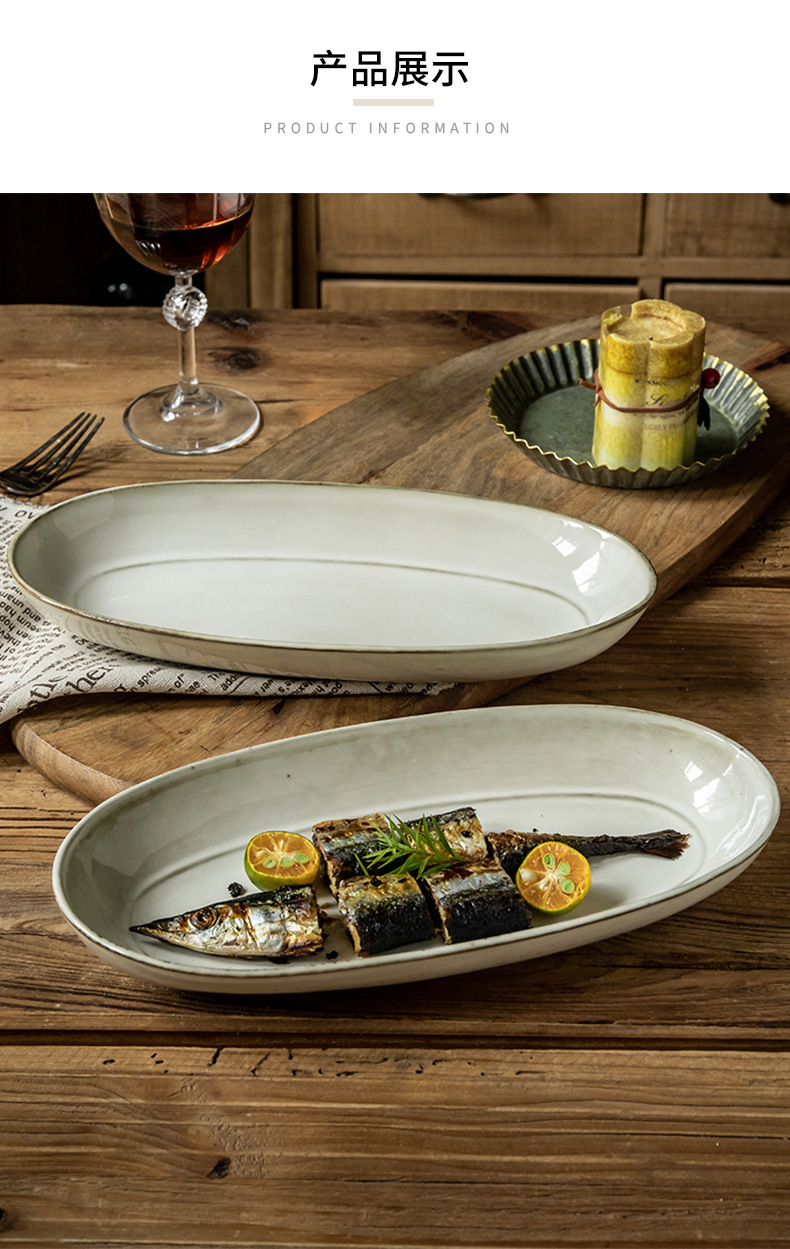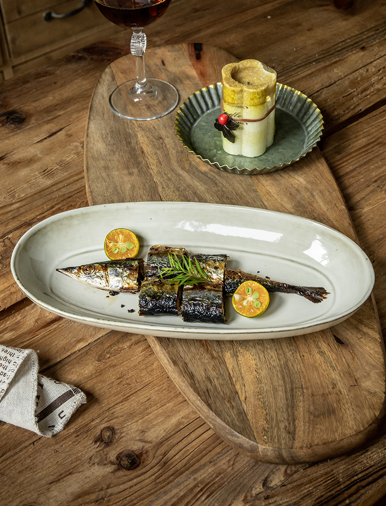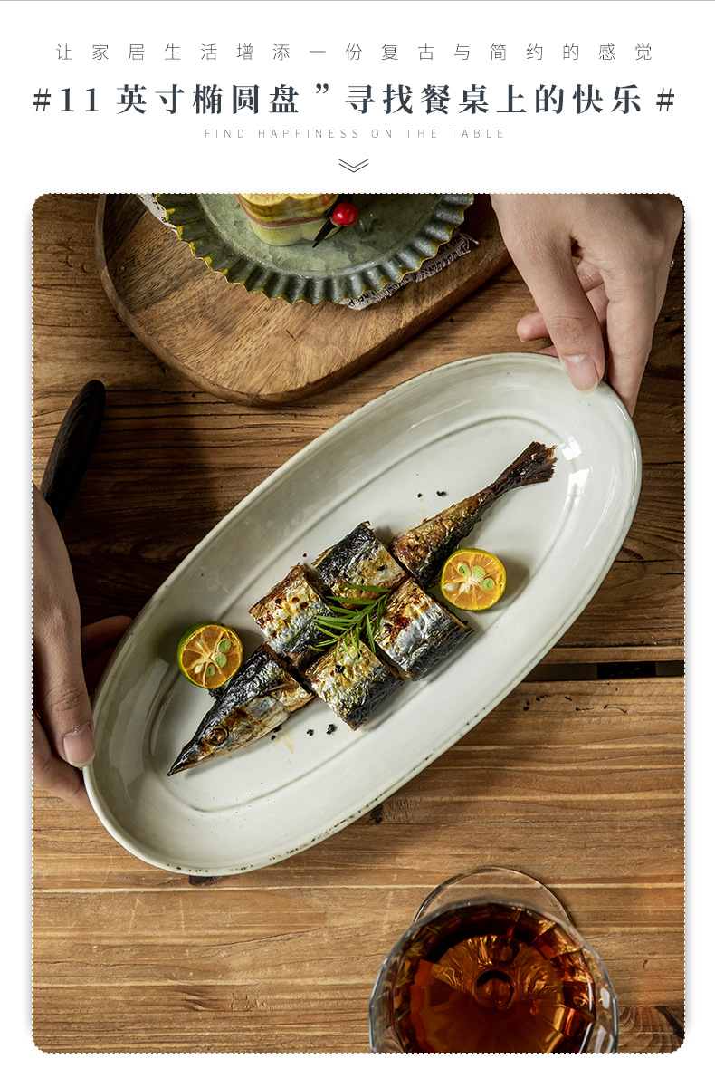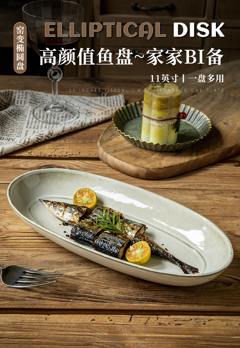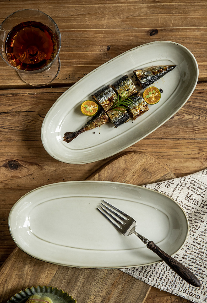 Placa de pescado vintage retro 11 pulgadas horno elíptico placa de pescado al vapor placa de cerámica doméstica placa de material diario exportación transfronteriza