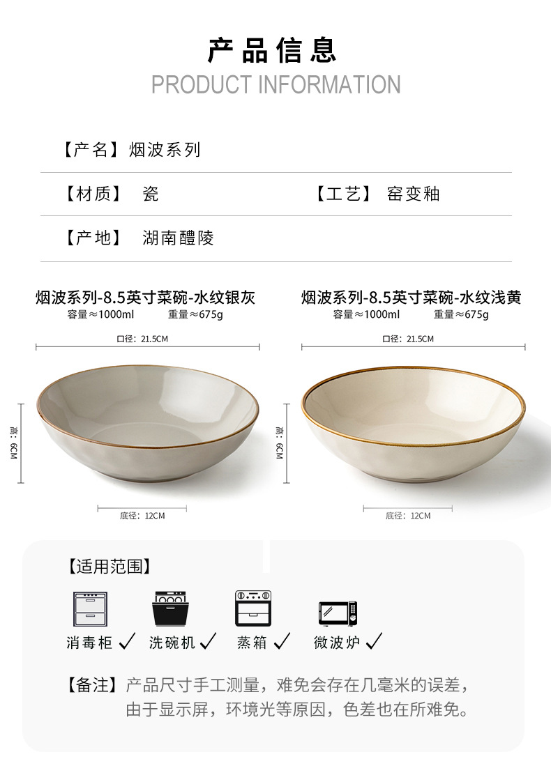 | Color | Serie de ondas de humo - tazón de verduras de 8,5 pulgadas - amarillo claro con patrón de agua, serie de ondas de humo - tazón de verduras de 8,5 pulgadas - gris plateado con patrón de agua |