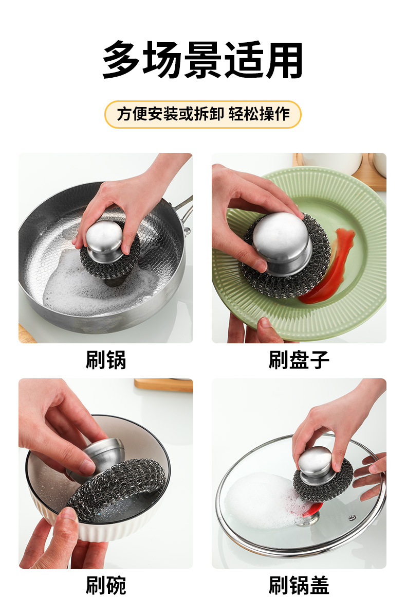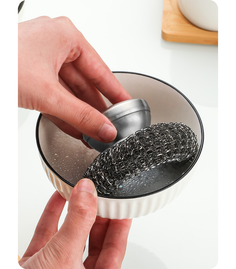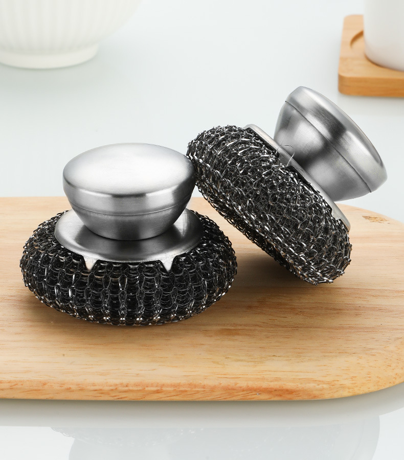Venta directa de fábrica Cepillo de alambre de acero inoxidable Cocina especial Lavado de platos Cepillo de olla artefacto Bola de limpieza de bola de alambre con mango