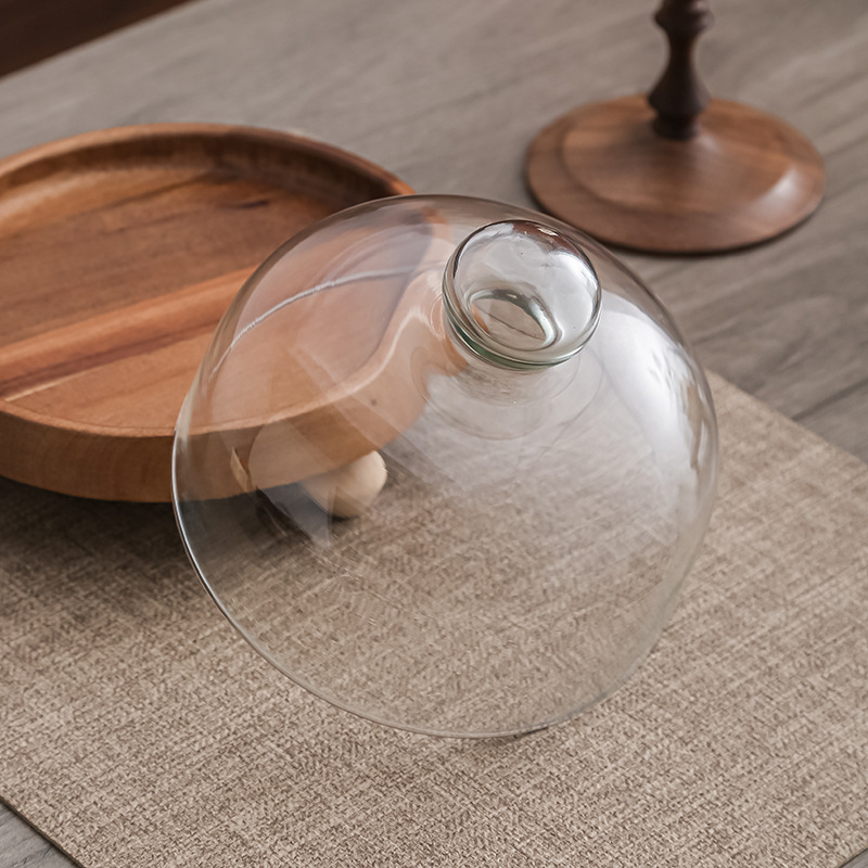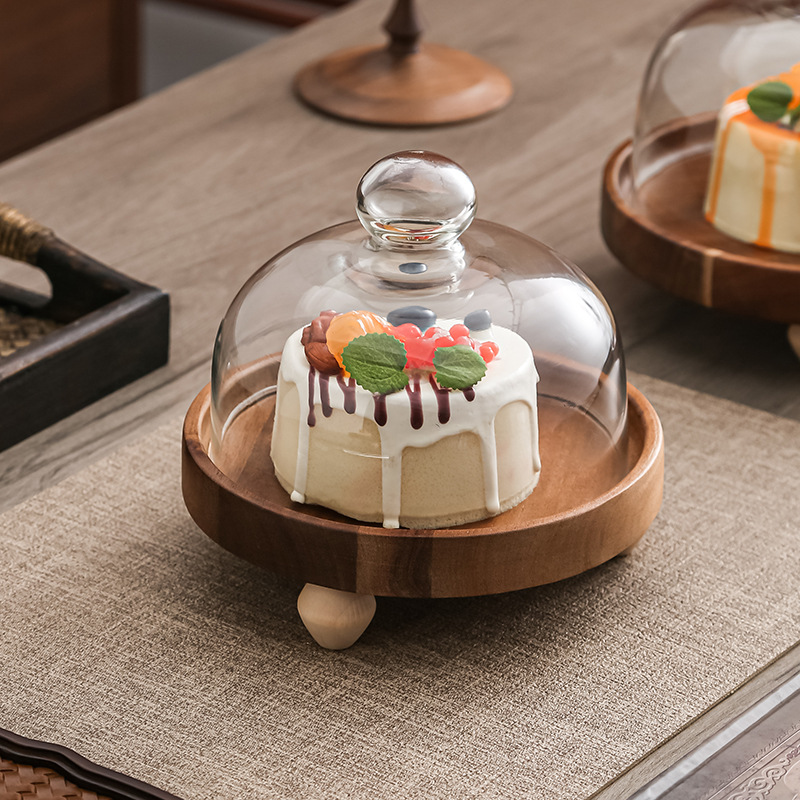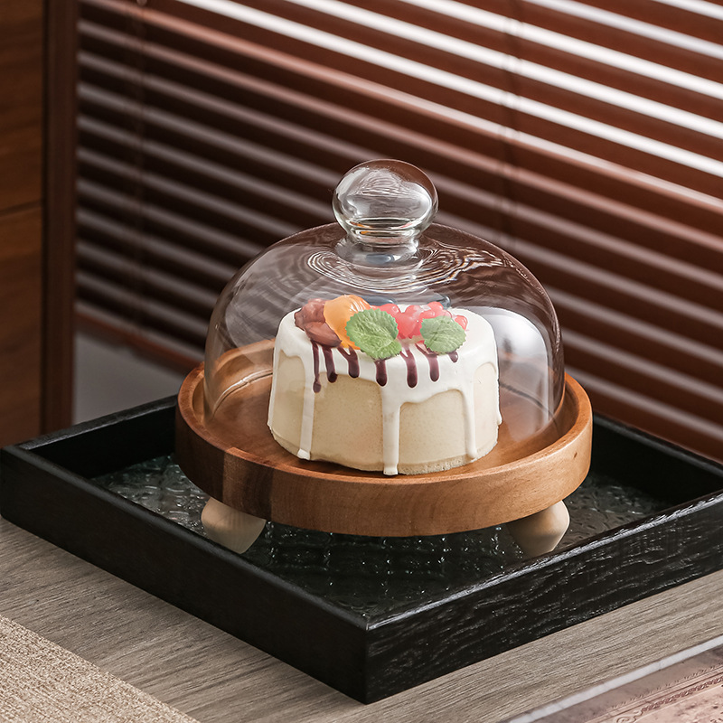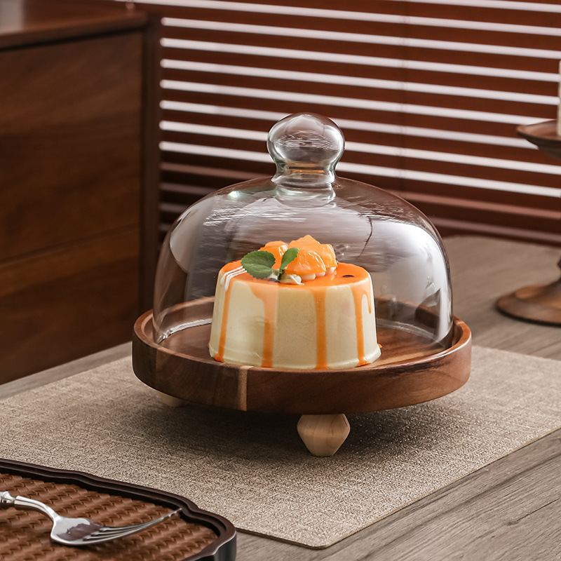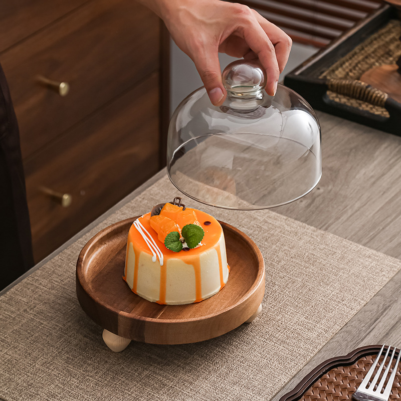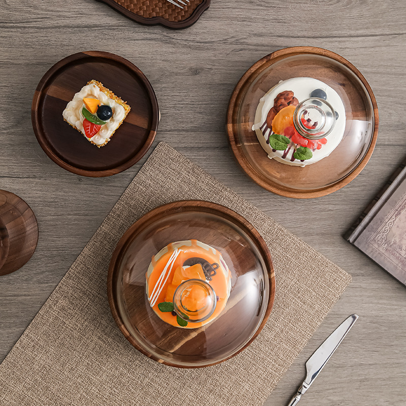 Pastel alto de madera de acacia, postre, tazón de fruta, plato de pan, plato de exhibición de restaurante de hotel, cubierta de vidrio a prueba de polvo