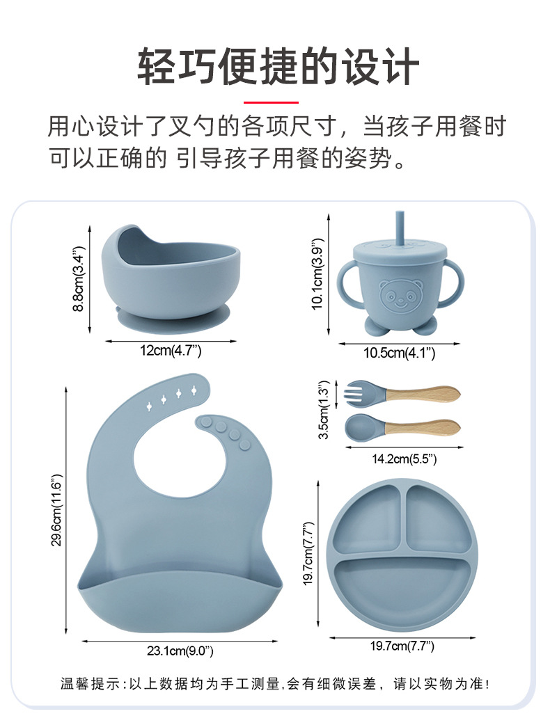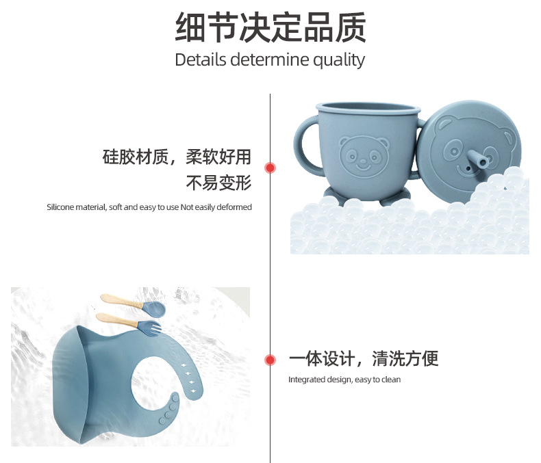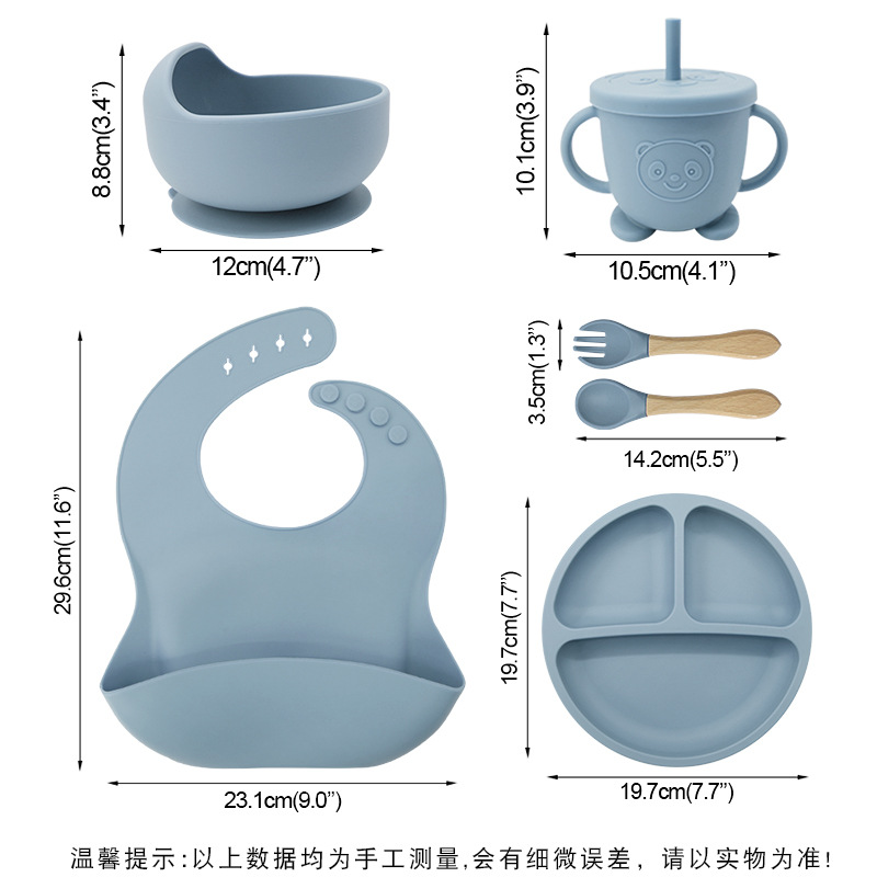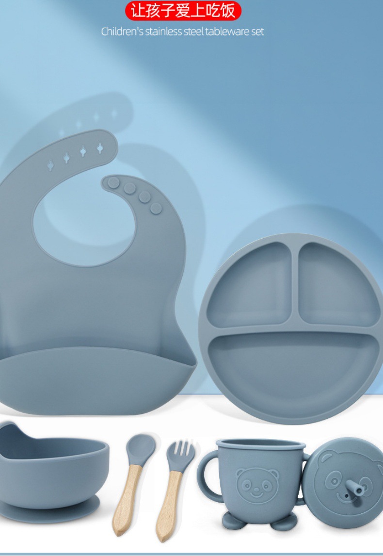 Juego de seis piezas de vajilla de silicona para niños, vajilla de alimentación para bebés para niños, tenedor, cuchara, ventosa, bolsa de arroz, taza de agua