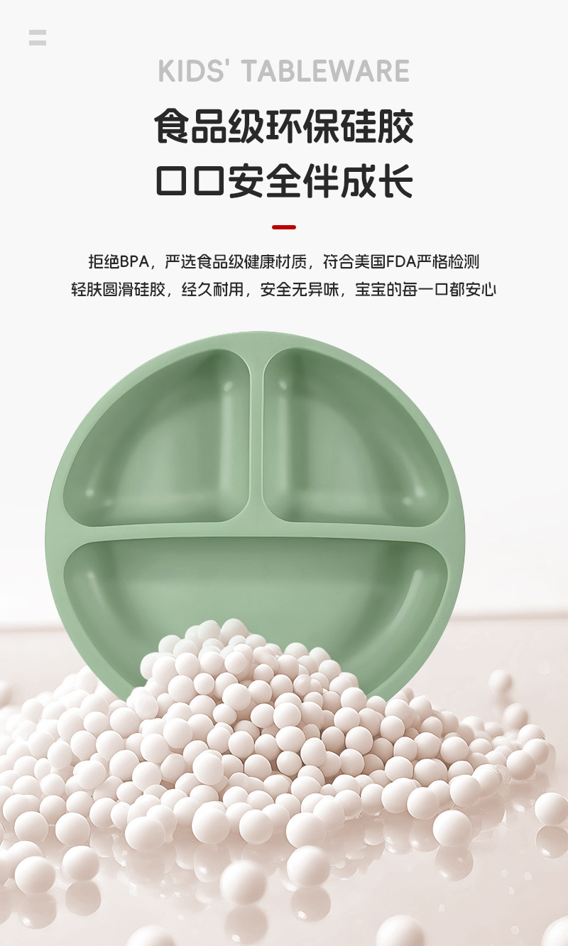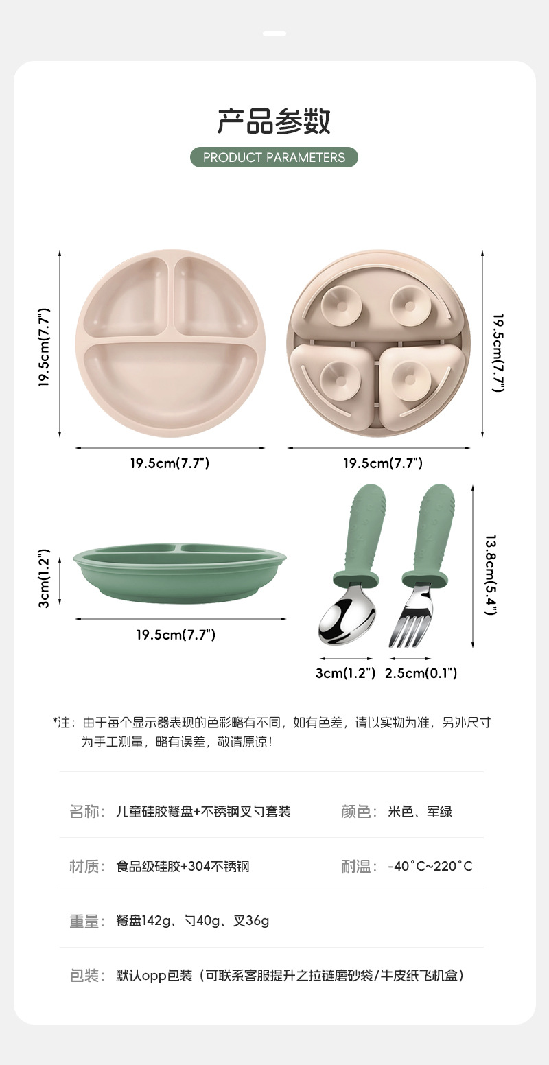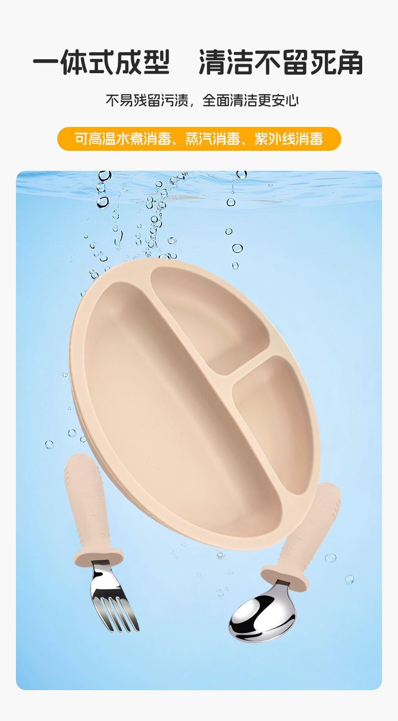 Placa de comedor de silicona para bebés 304 tenedor y cuchara de acero inoxidable, plato de ventosa, alimento complementario de tres compartidos para bebés de grado alimenticio resistente a altas temperaturas