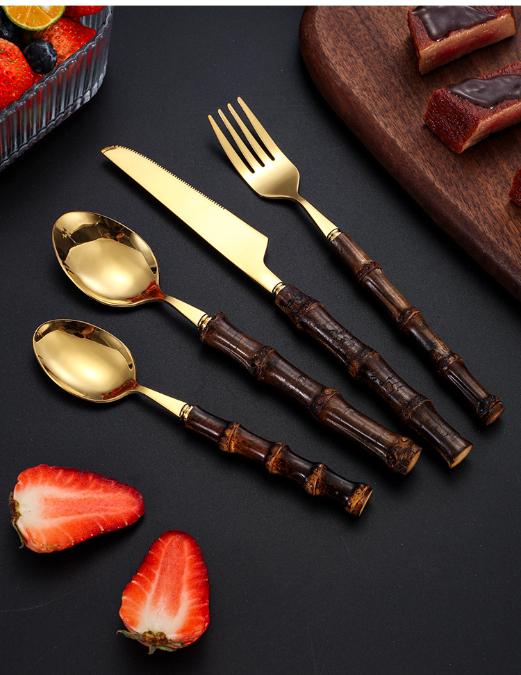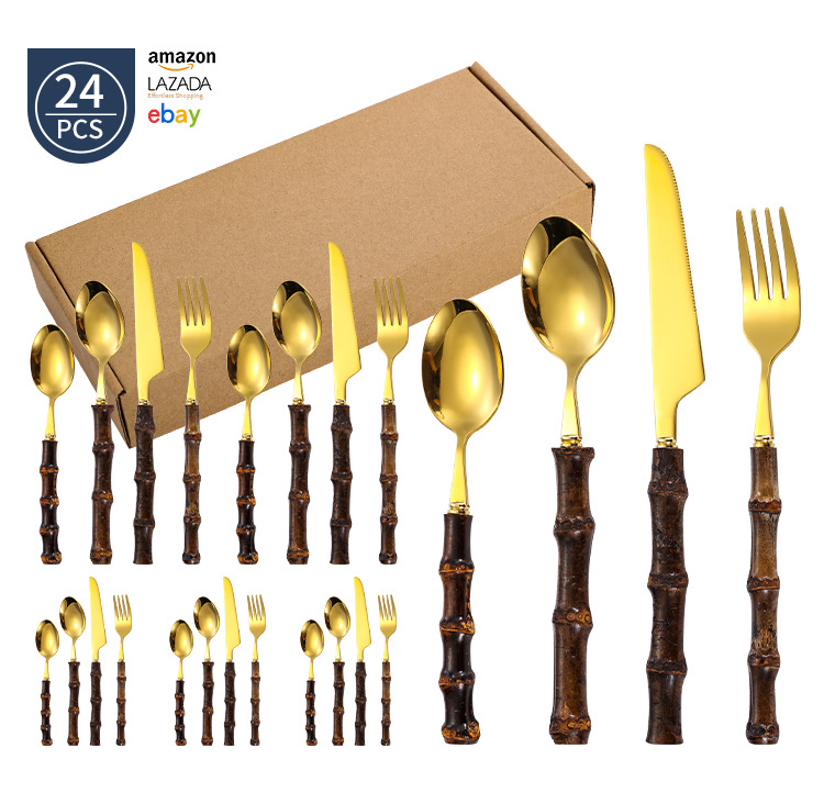 Conjunto de cubiertos transfronterizos mango de bambú natural cuchillo y tenedor cuchara creativa cuchillo y tenedor de acero inoxidable hotel conjunto de regalo