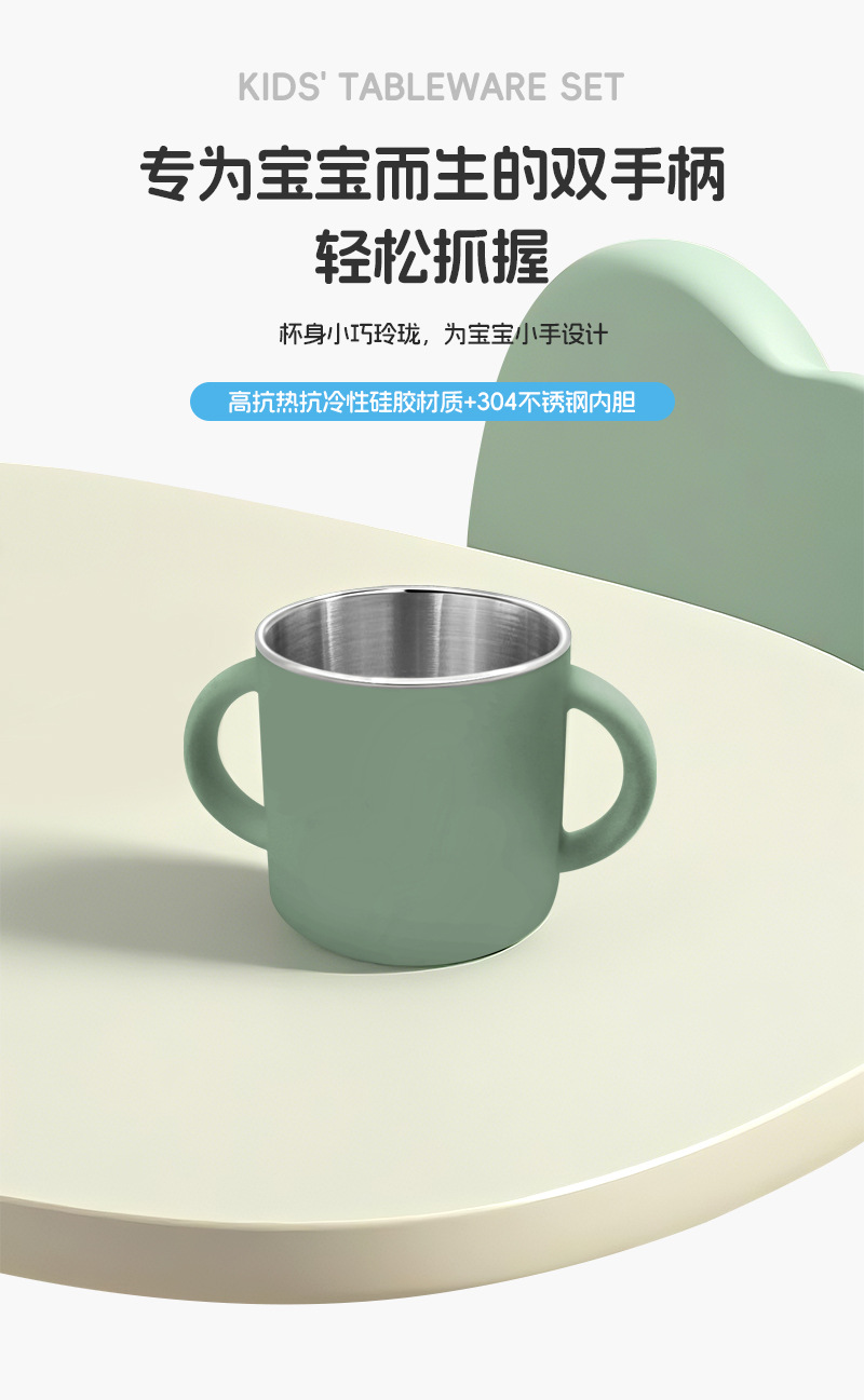 Placa de comedor de acero inoxidable para niños, taza de agua de silicona binaural, taza para beber para bebés de grado alimenticio
