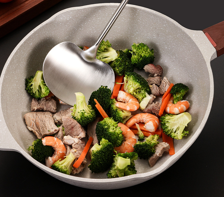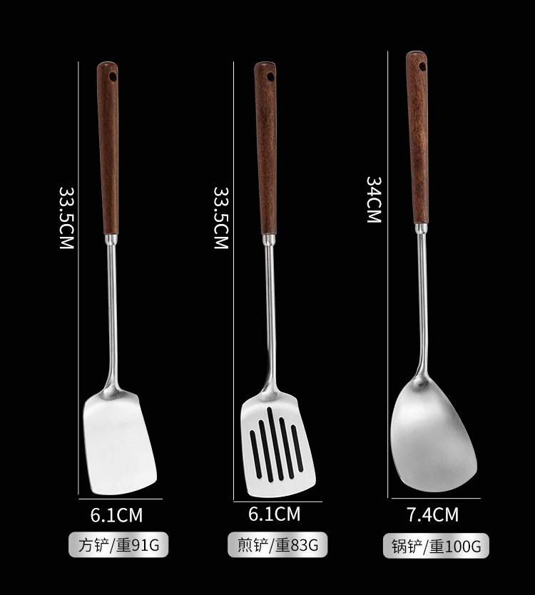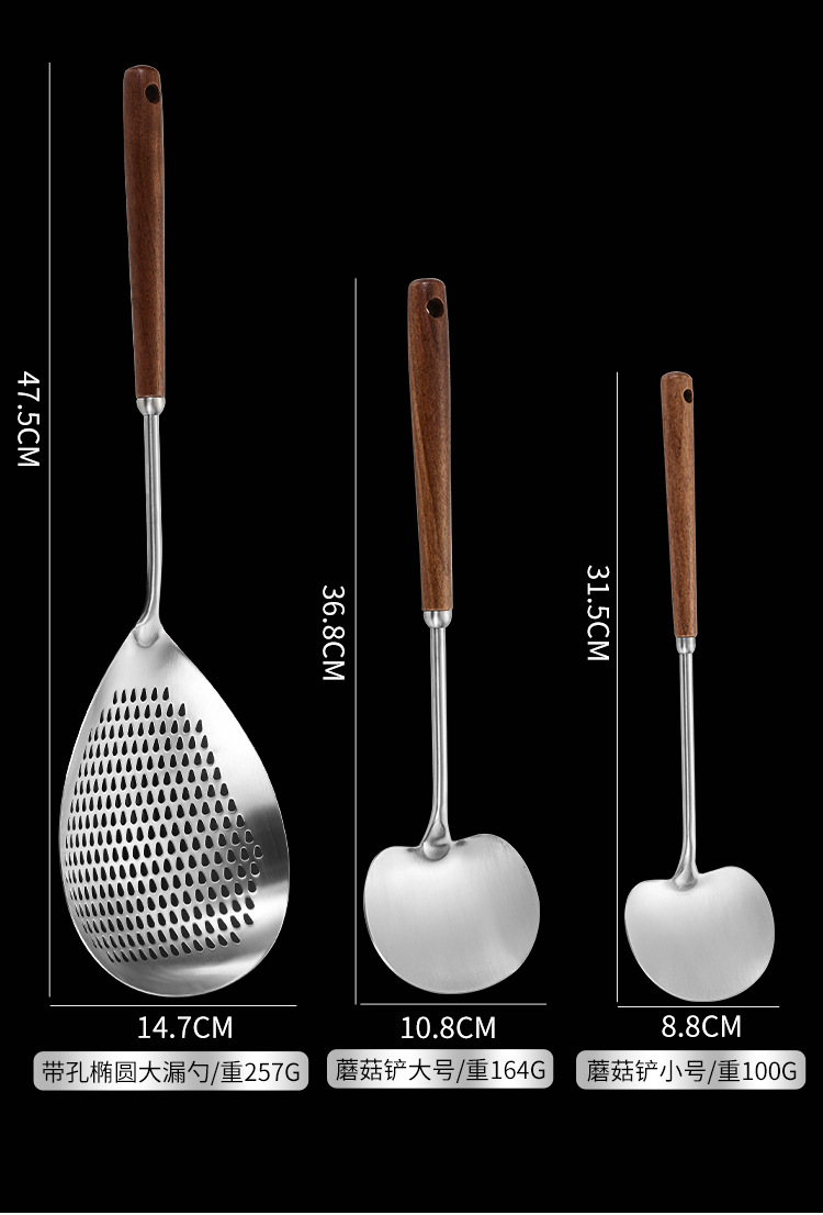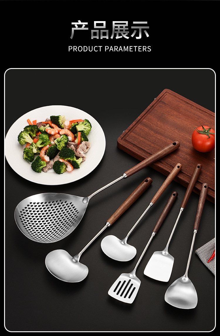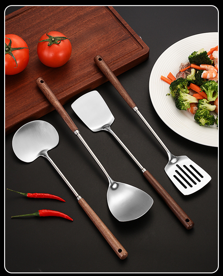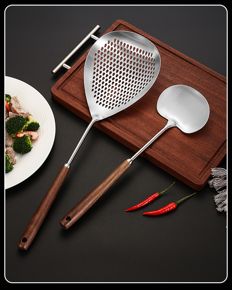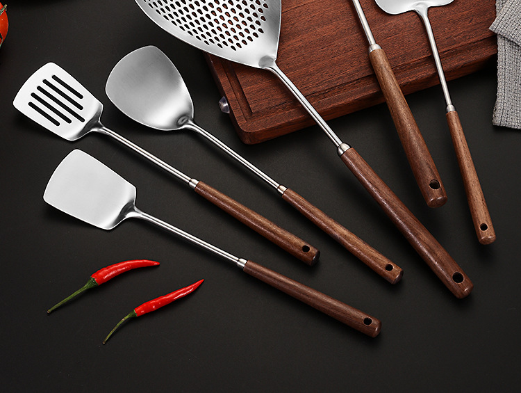 Paleta de acero inoxidable 304 utensilios de mango de madera para el hogar, colador de alta temperatura, juego de utensilios de cocina, cuchara de sopa, suministros de cocina