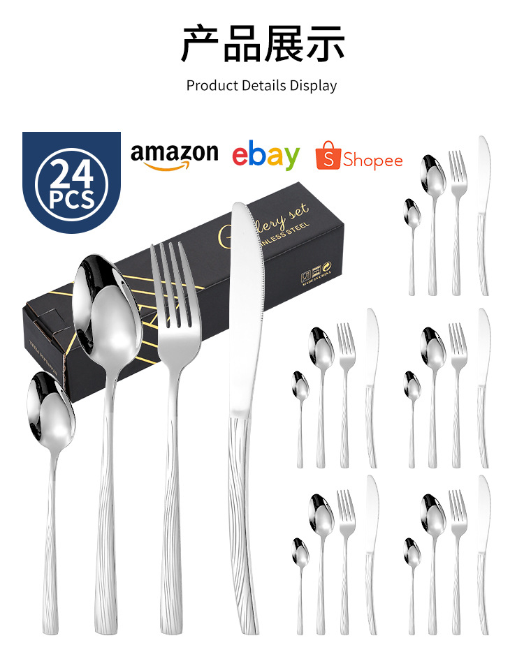 Juego de vajilla de 24 piezas de cuchillo y tenedor de acero inoxidable de venta caliente transfronteriza caja de regalo cuchara de comida occidental de Amazon dorada chapada en titanio