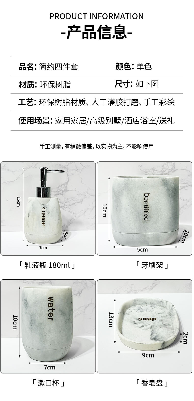 | Especificaciones | Juego de cuatro piezas con patrón de mármol,Botella de loción,Soporte para cepillo de dientes,Taza de boca |