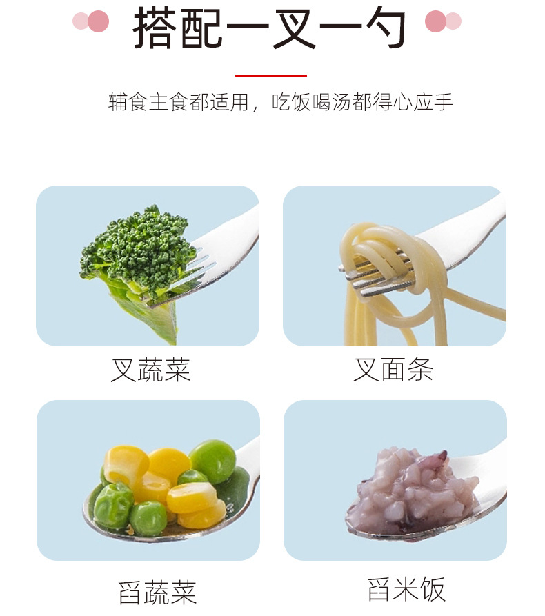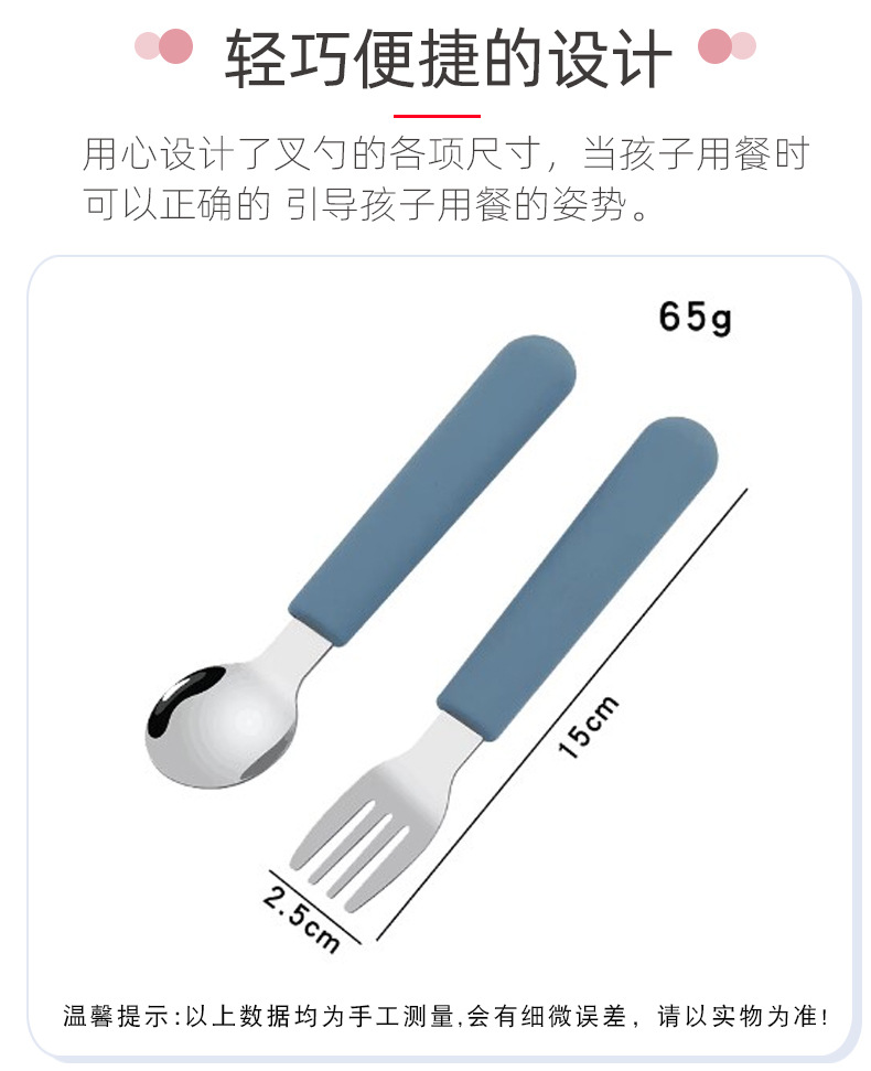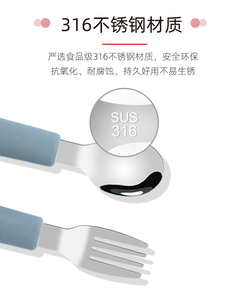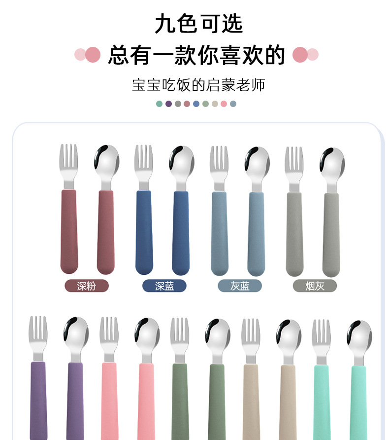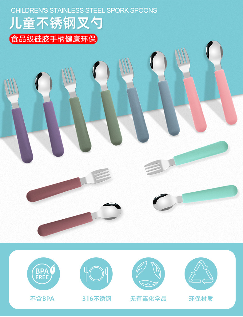 Cross-border 316 mango de silicona de acero inoxidable tenedor y cuchara para niños juego de 2 piezas para bebés comiendo cuchara de entrenamiento de mango largo más tenedor