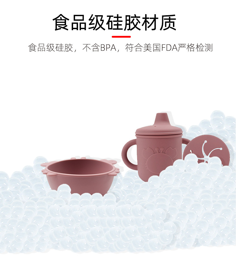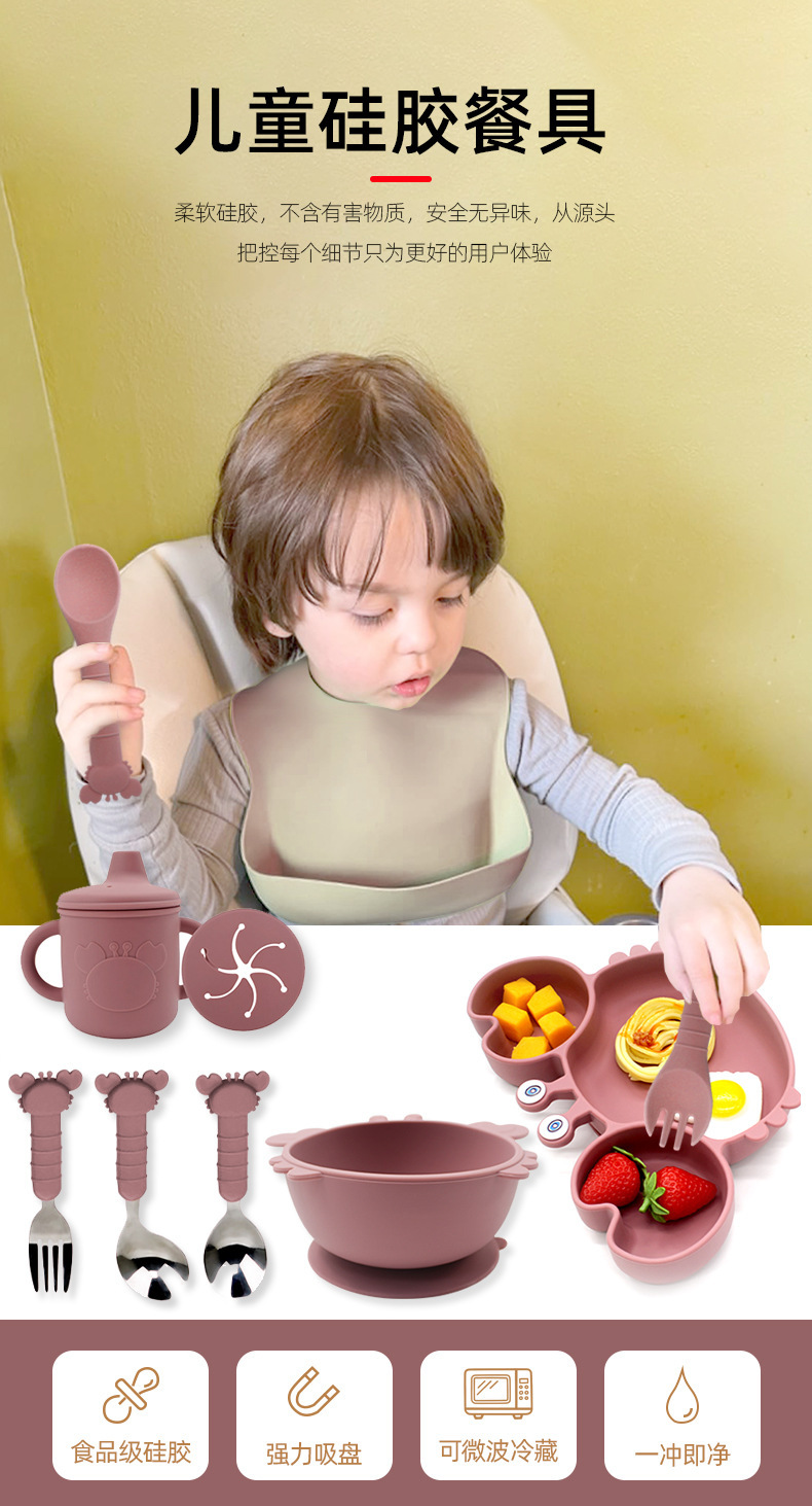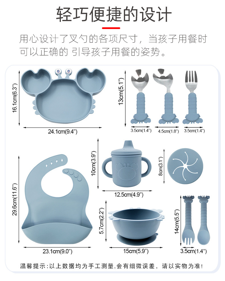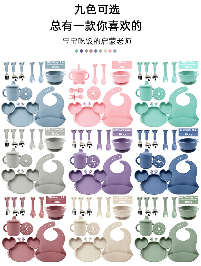 Bebé de grado alimenticio silicona cubierta set cangrejo plato set diez piezas bebés silicona anti-caída resistente al calor ventosa cucharas