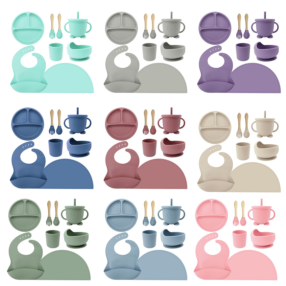Venta caliente transfronteriza Vajilla de silicona estilo ins Juego de alimentación para niños de 8 piezas Bandeja divisora de silicona Mantel de mesa bandeja de succión tazón cuchara