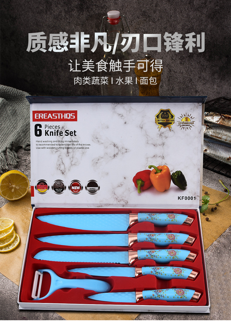 Nuevo patrón de mampostería transfronterizo doble galvanoplastia cabeza de color de flores herramientas de cuchillo de regalo de acero inoxidable herramientas de cocina