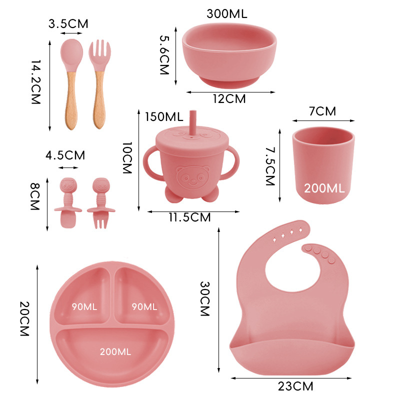 Traje de vajilla de silicona plato de los niños maternal y niño suministros de alimentación complementaria traje de nueve piezas babero de succión cuadrado