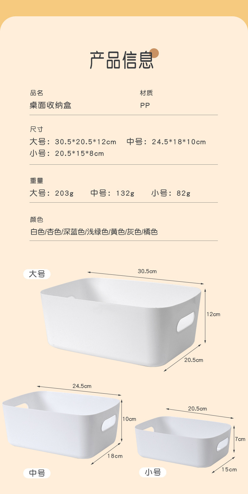 | Color | Amarillo tamaño pequeño,Naranja Tamaño pequeño,Verde tamaño pequeño,Blanco tamaño pequeño,Albaricoque tamaño pequeño,Gris tamaño pequeño,Blanco medio,Gris medio,Albaricoque medio,Verde medio,Amarillo medio,Naranja mediano,Verde grande,Amarillo grande,Naranja grande,Gris grande,Albaricoque de gran tamaño |