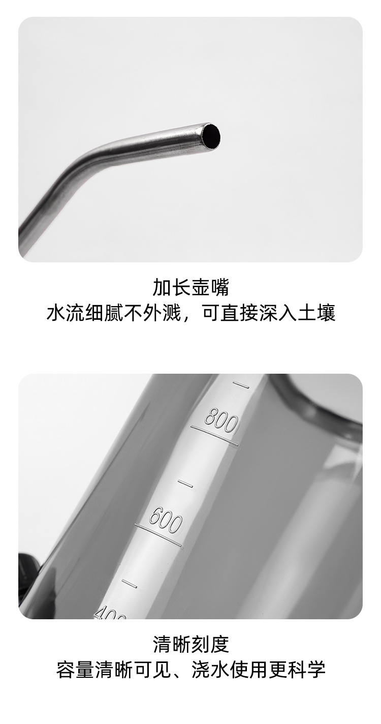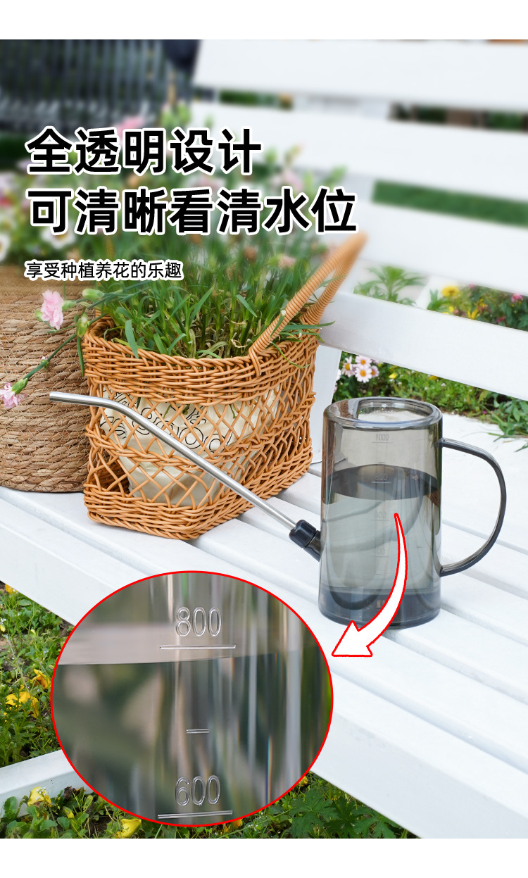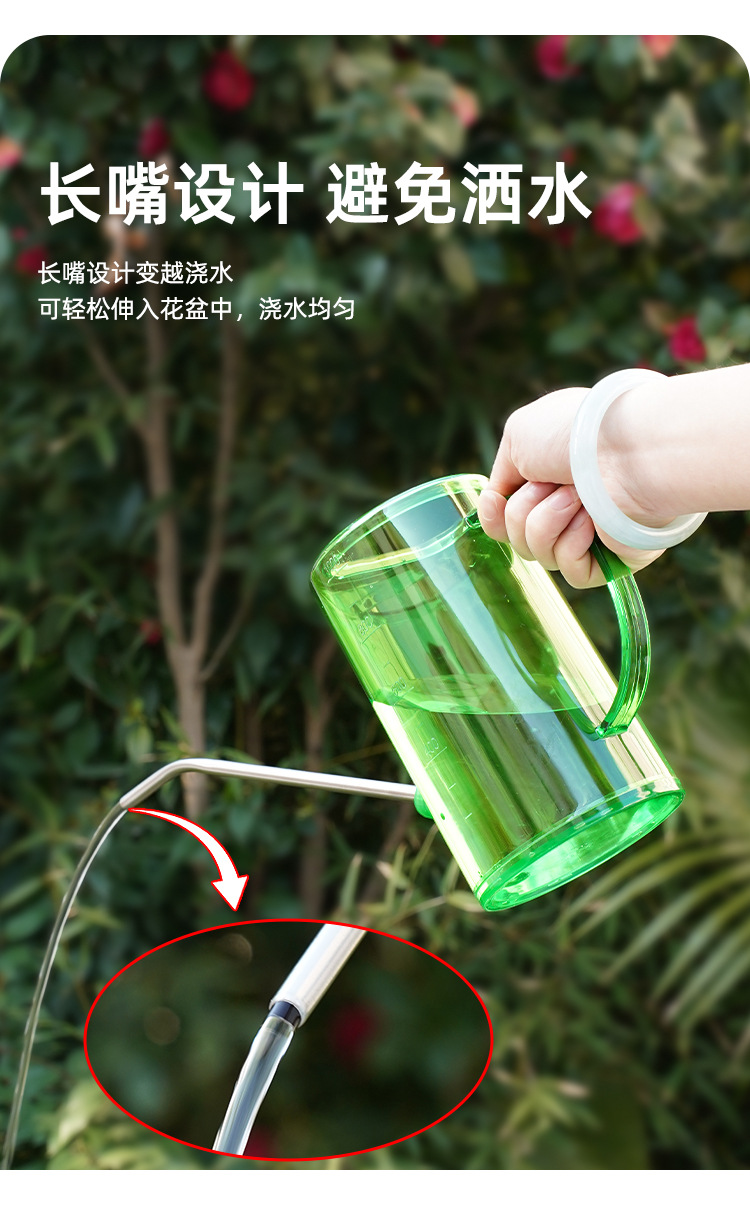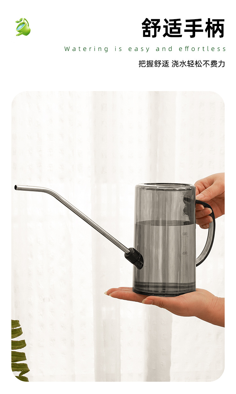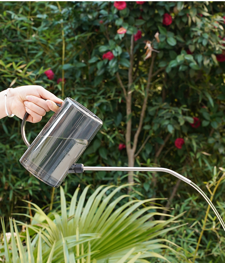 Botella de riego de boca larga de acero inoxidable, botella de riego doméstica, herramienta de jardinería de escala transparente de maceta de plantación verde