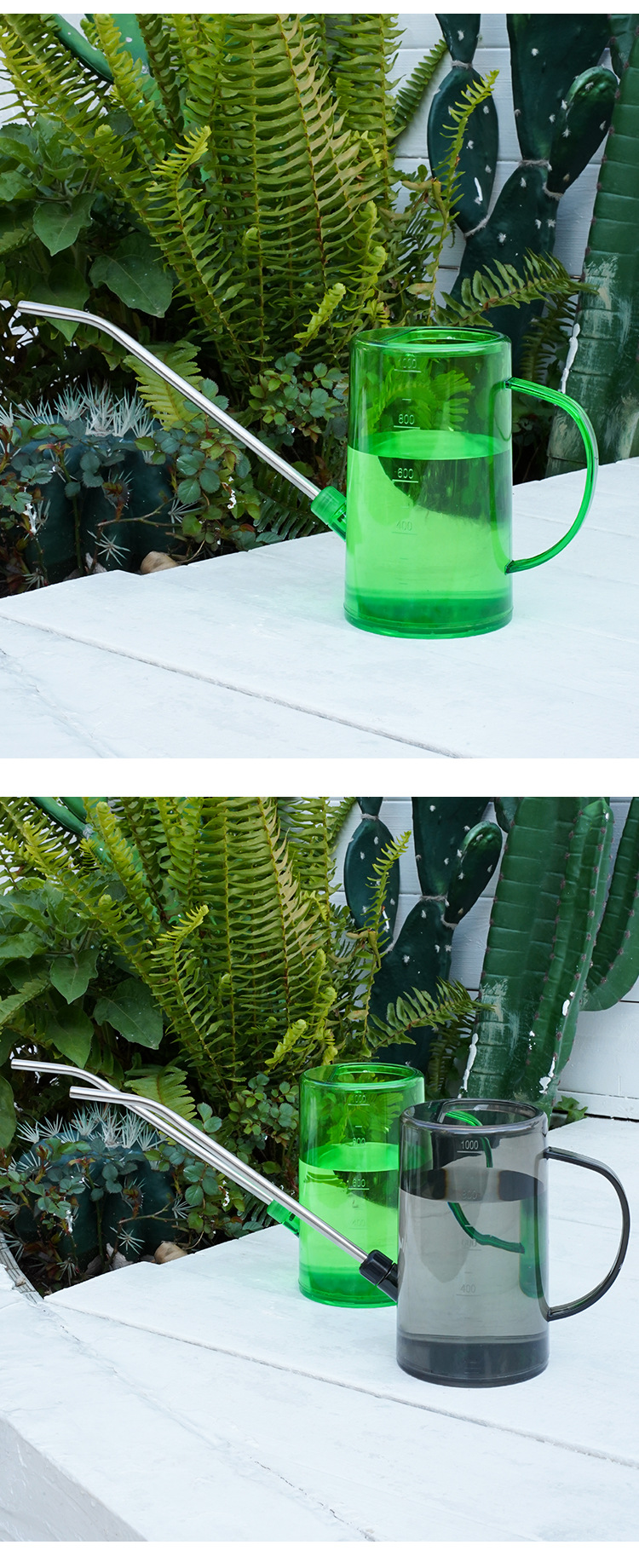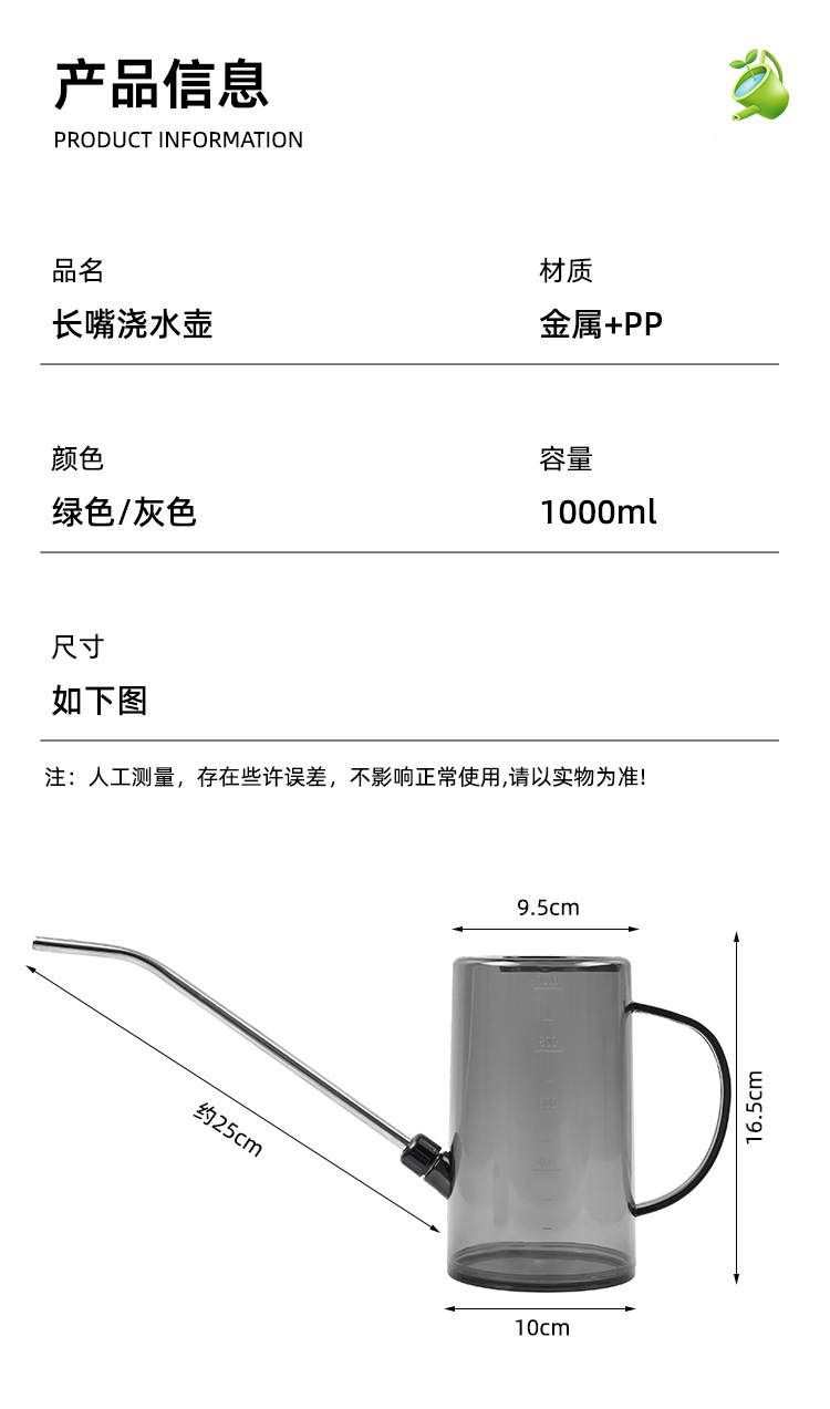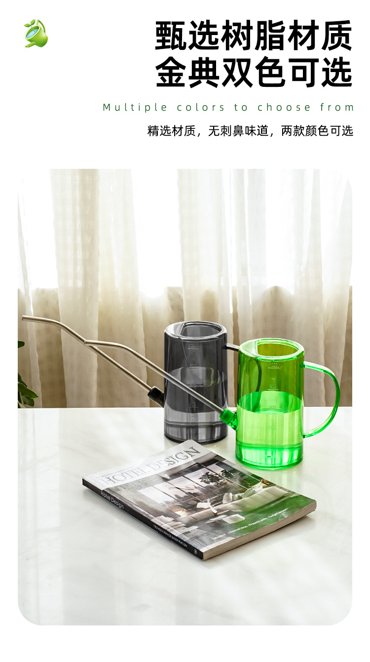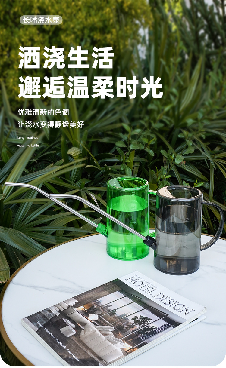 Botella de riego de boca larga de acero inoxidable, botella de riego doméstica, herramienta de jardinería de escala transparente de maceta de plantación verde