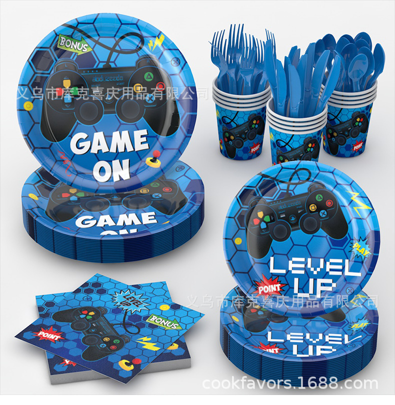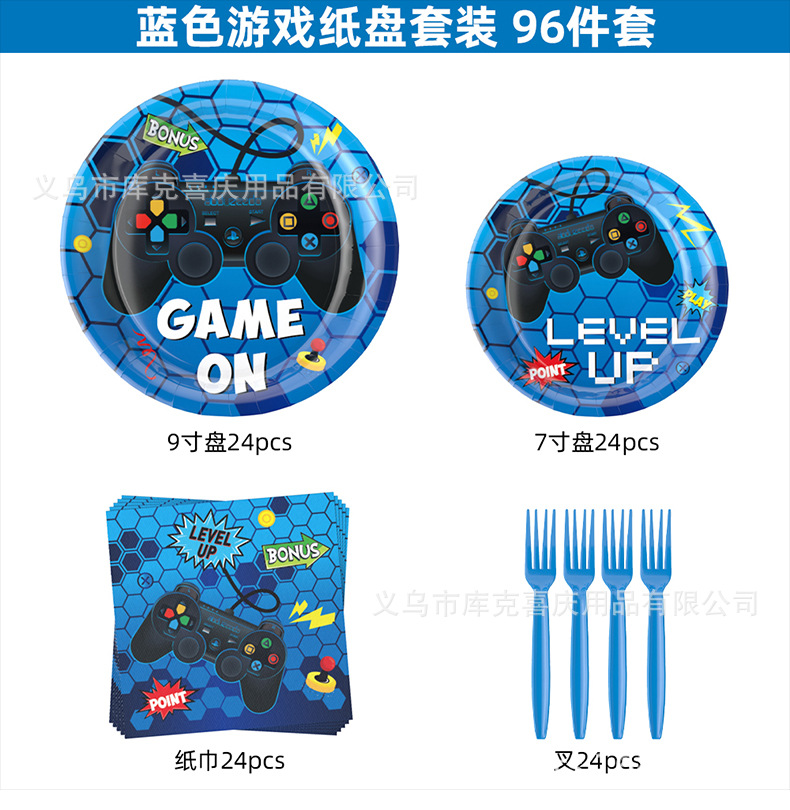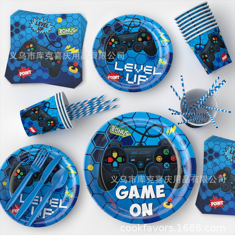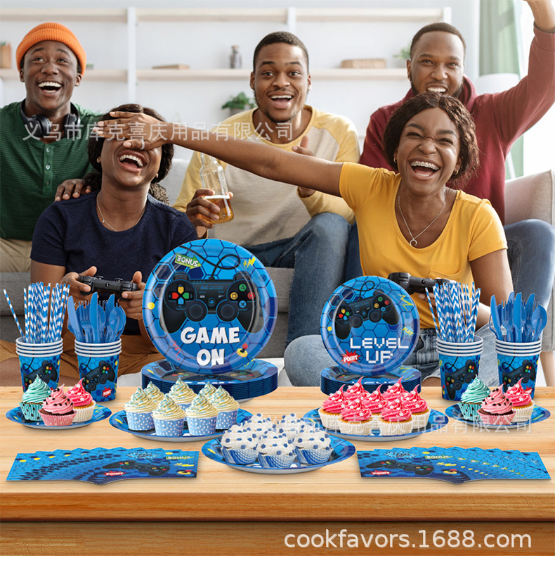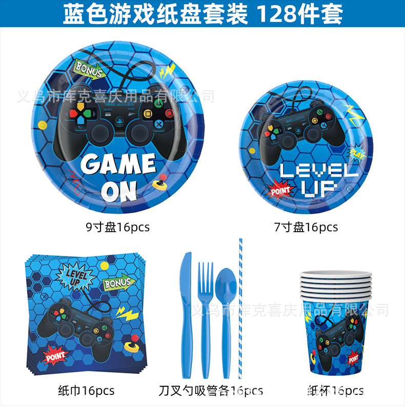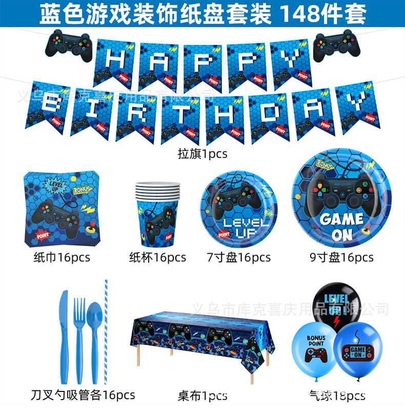 Nuevos juegos azules con tema de decoración de fiesta para niños cartón de cumpleaños tazas de papel con bandera de globo conjunto de decoración