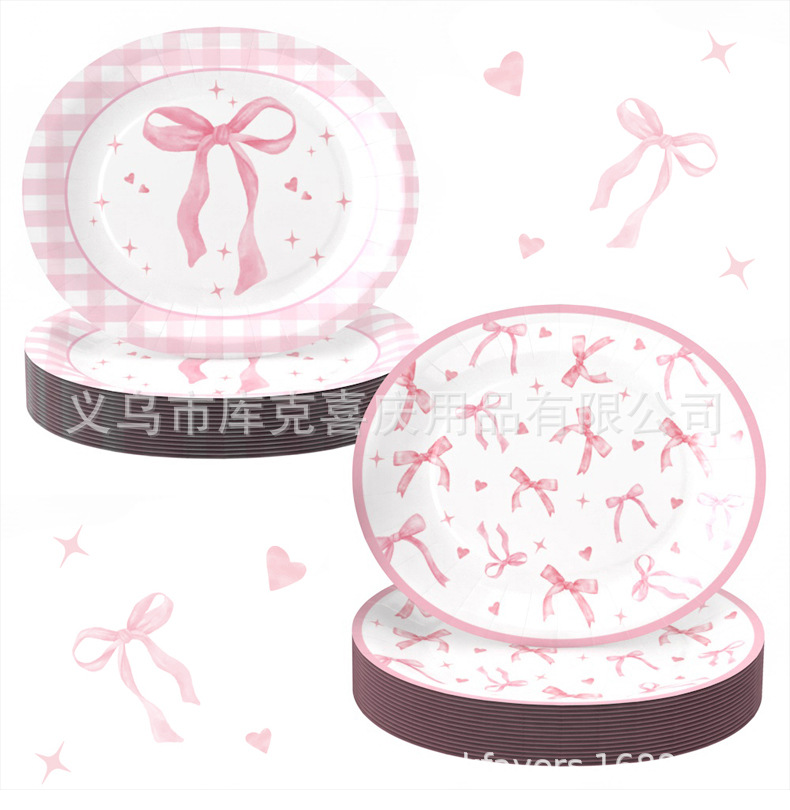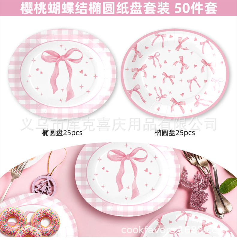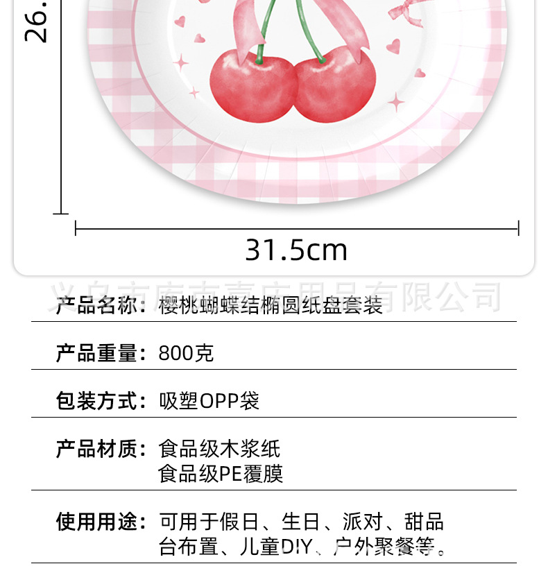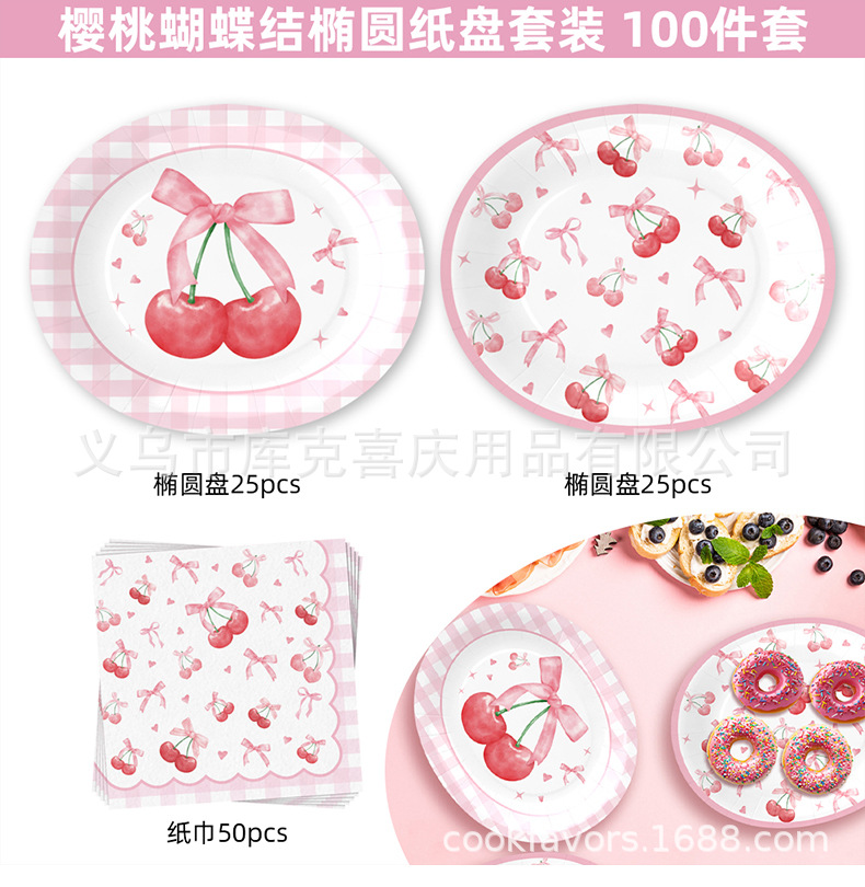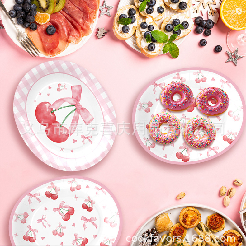 Tema de lazo de cereza transfronterizo Placa de comida ovalada de 12 pulgadas Placa de papel desechable de cumpleaños para niños Suministros de vajilla de papel