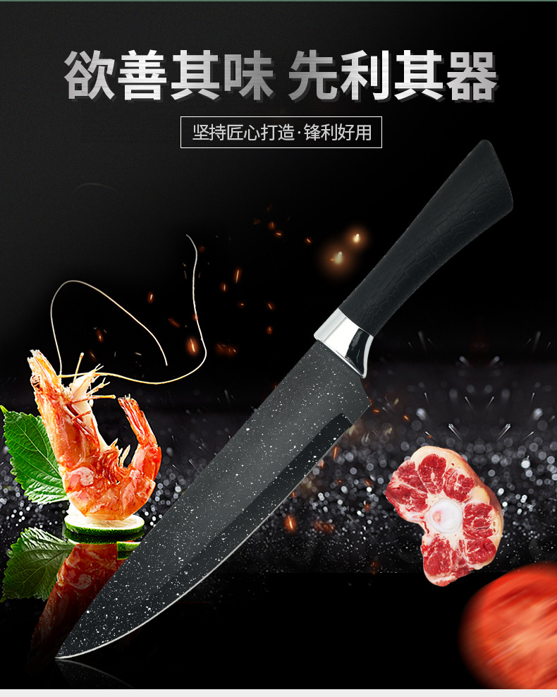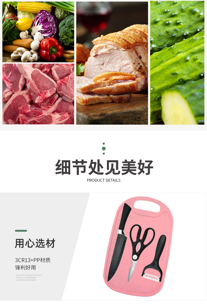 Juego de cuchillos de venta caliente de fábrica con tabla de cortar, súper con agujeros, se puede colgar al por menor y al por mayor, cuchillo de punto de estrella negro, tarjeta de succión de cuatro piezas
