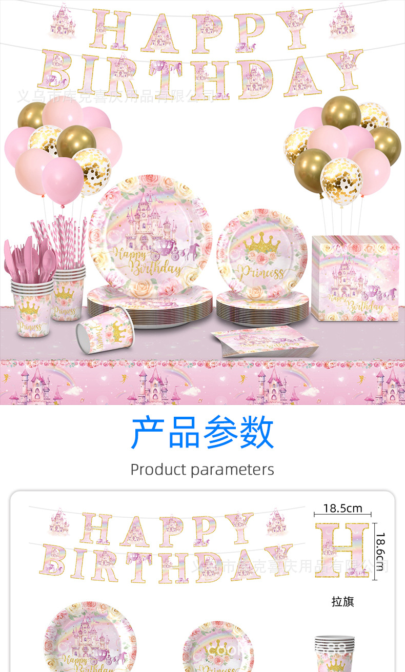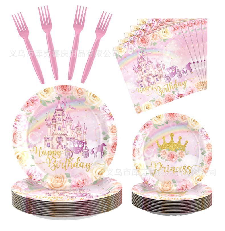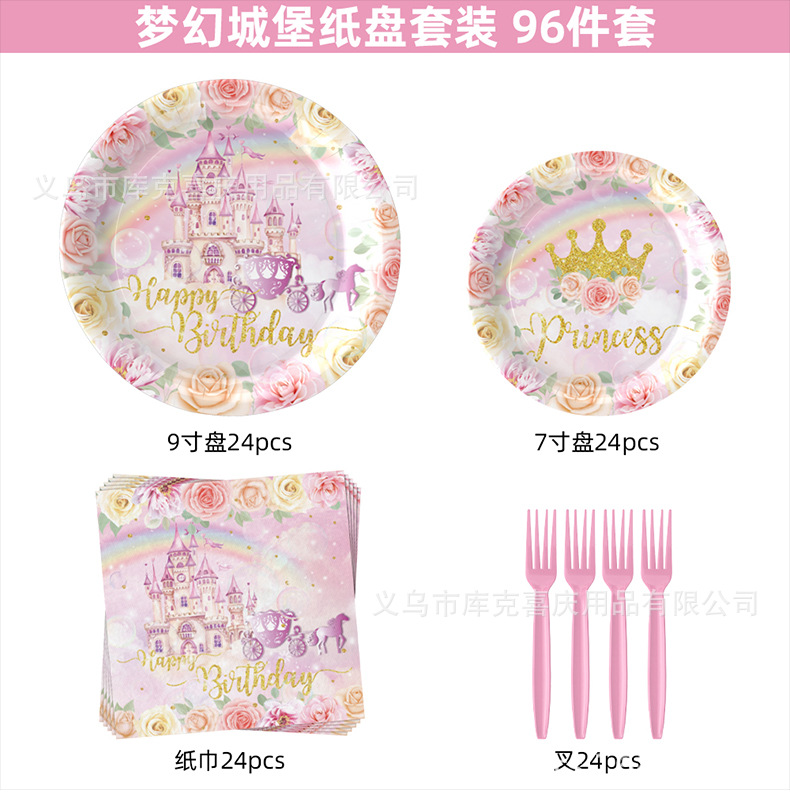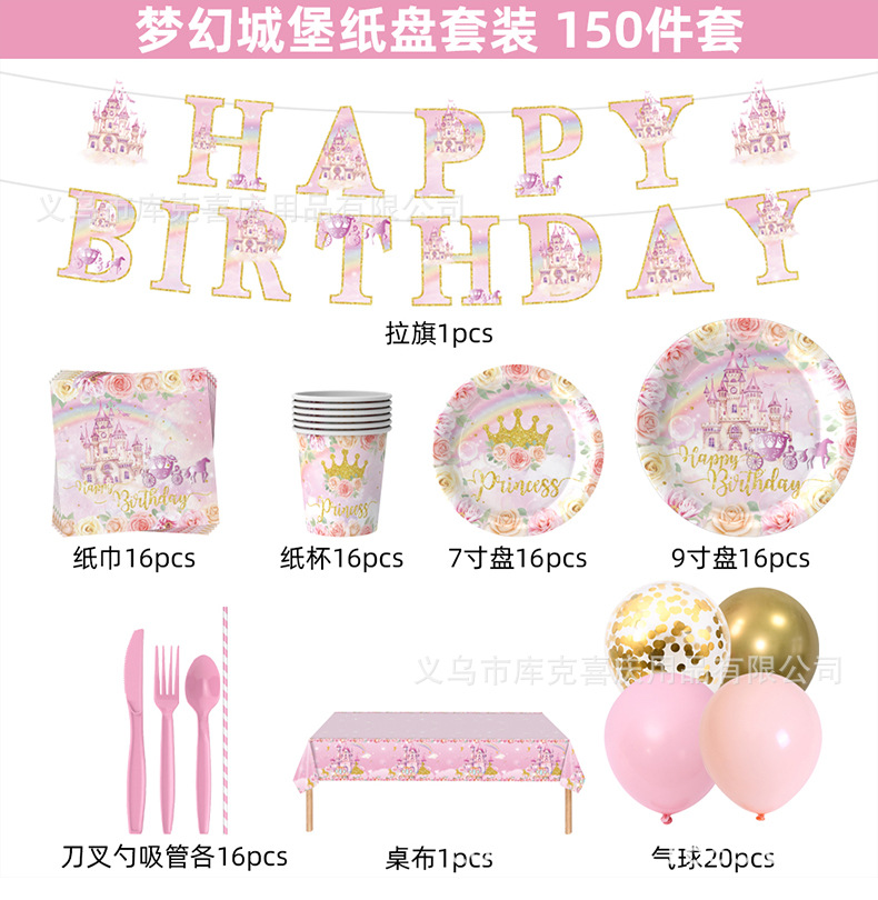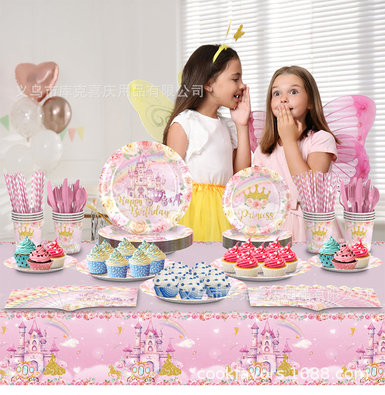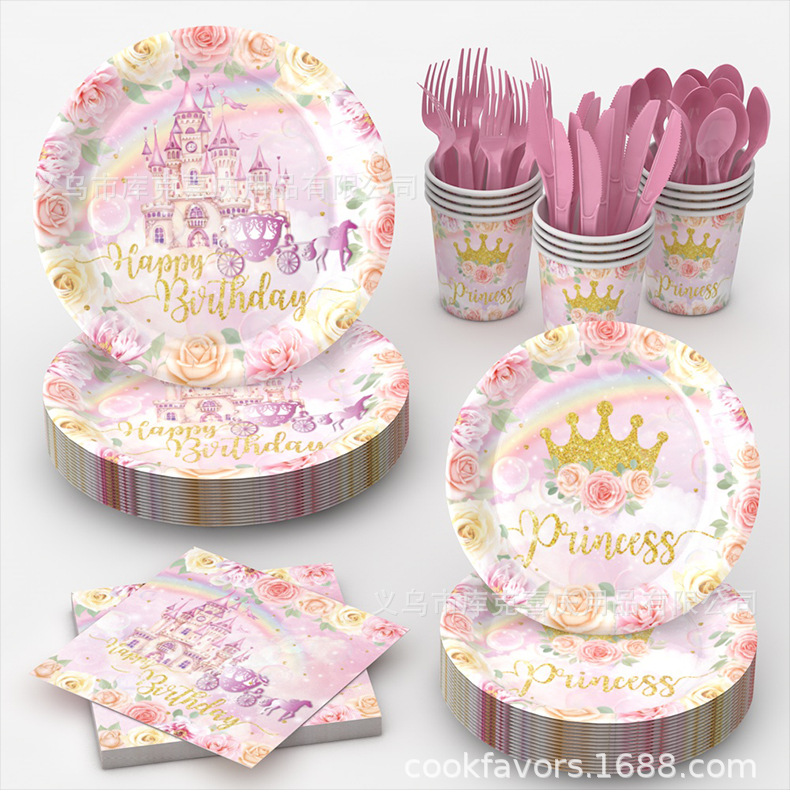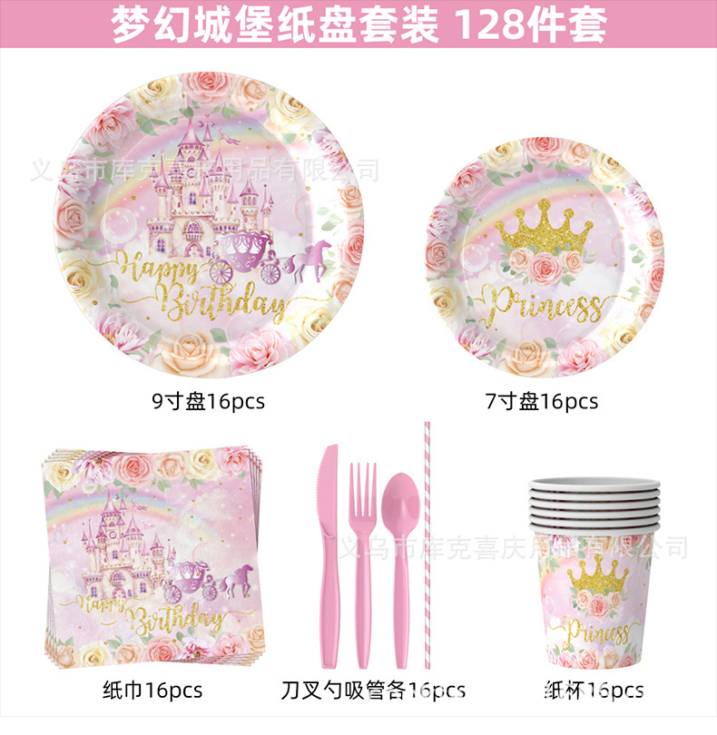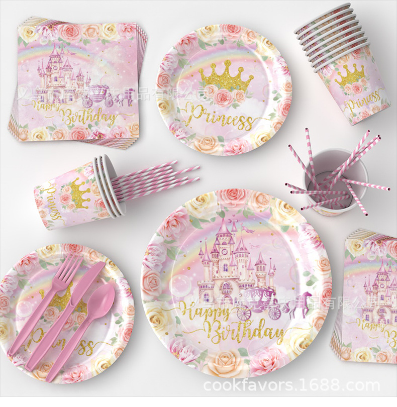 Nuevo castillo de ensueño tema de fiesta de cumpleaños artículos de decoración público bandeja de papel desechable taza de papel conjunto de decoración de toallas