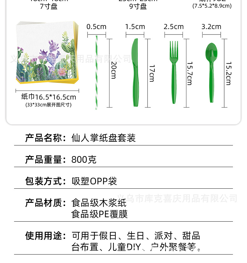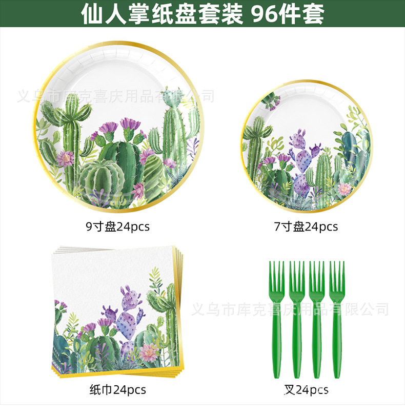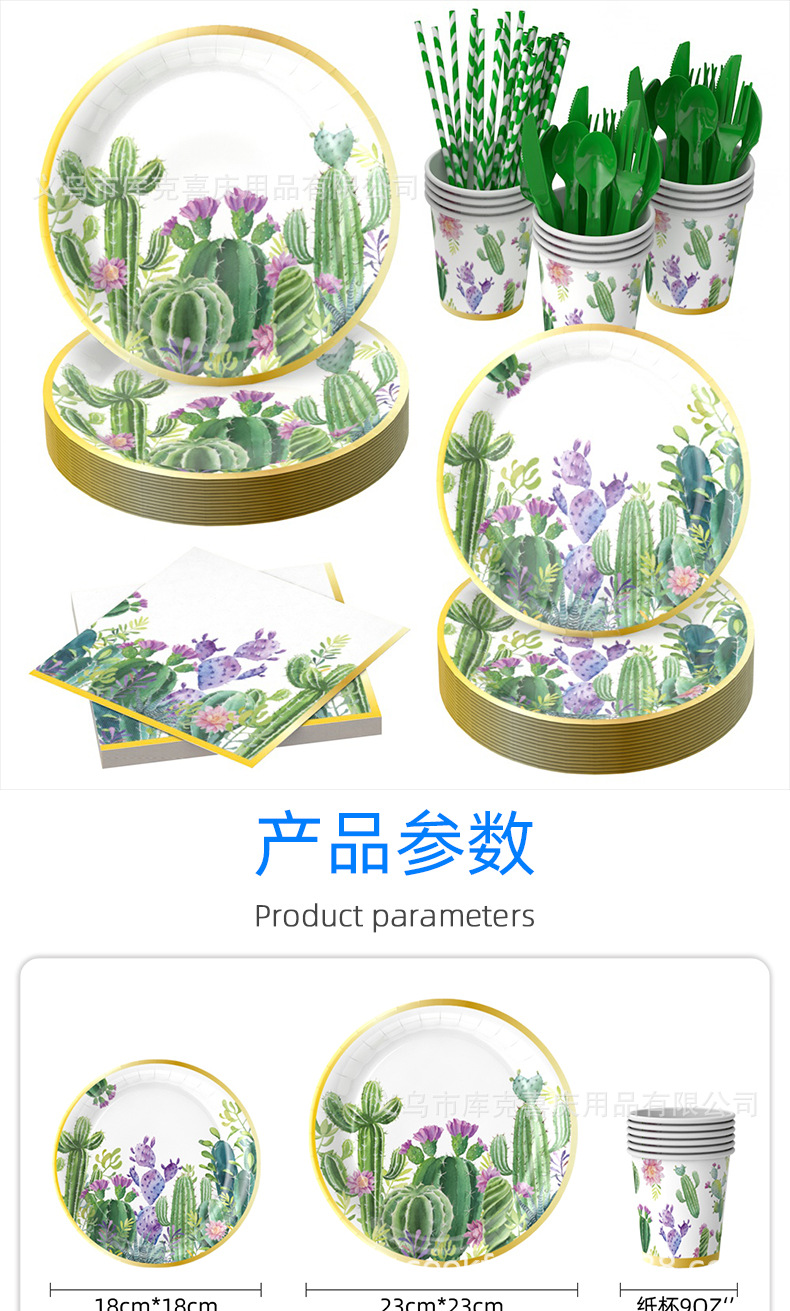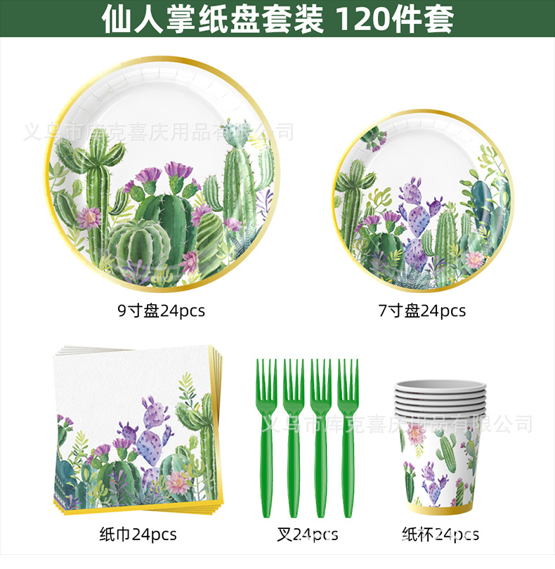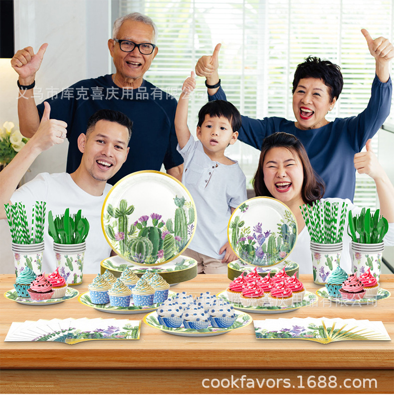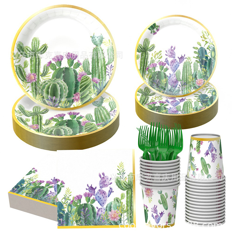 Nuevo cactus de verano, bandeja de papel carnoso, taza de papel, juego de vajilla de toallas de papel, artículos de decoración de fiesta mexicana