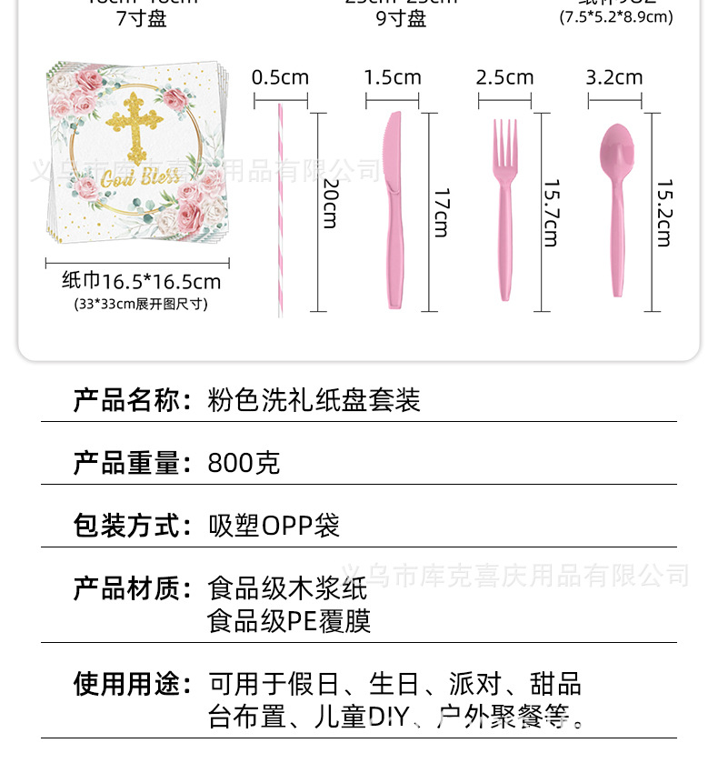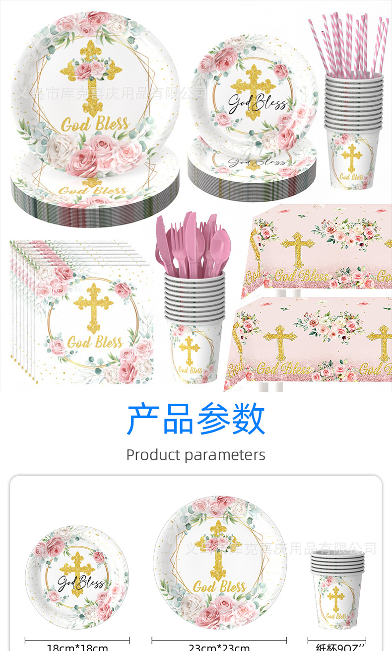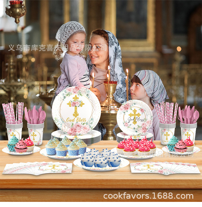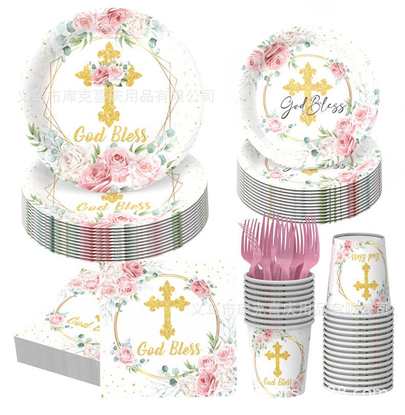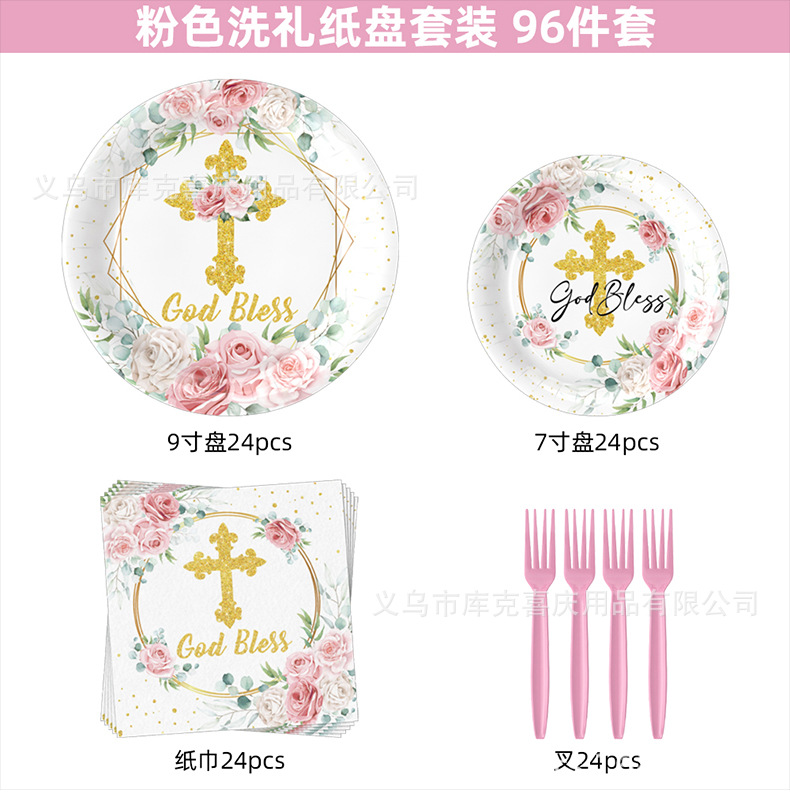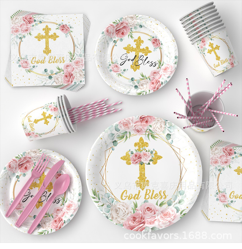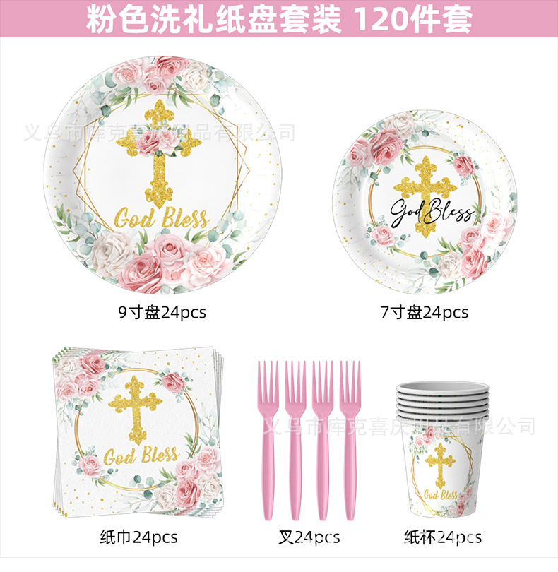 Nuevos platos de fiesta de la Santa Comunión de la Cruz Rosa Bautismo de bebés bandeja de papel desechable taza de papel toalla decoración de fiesta