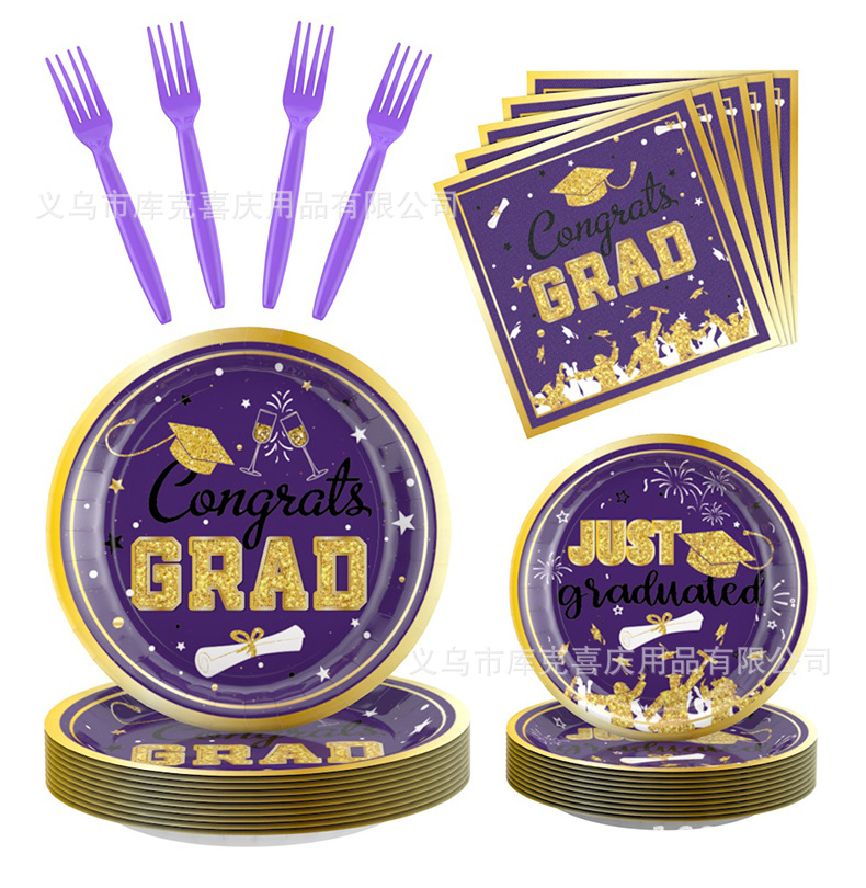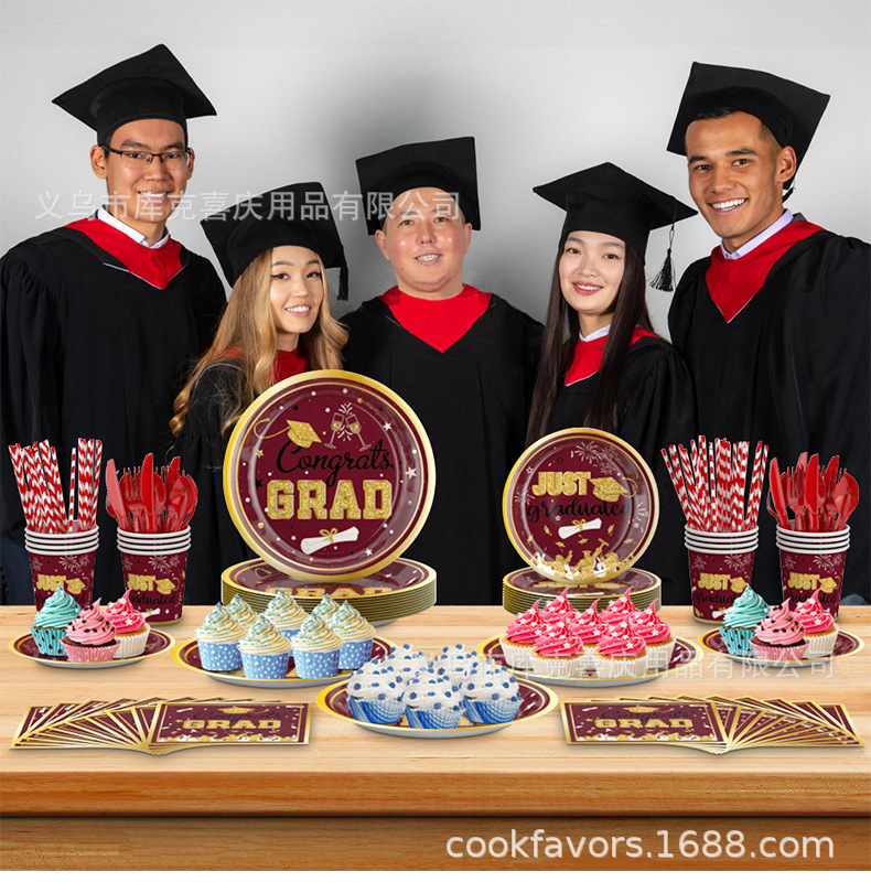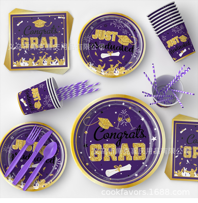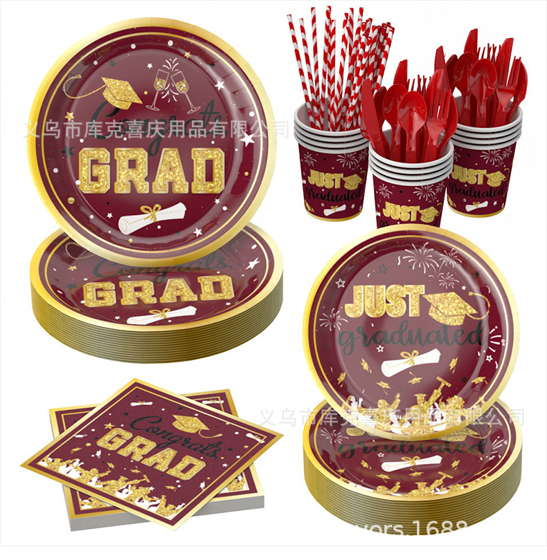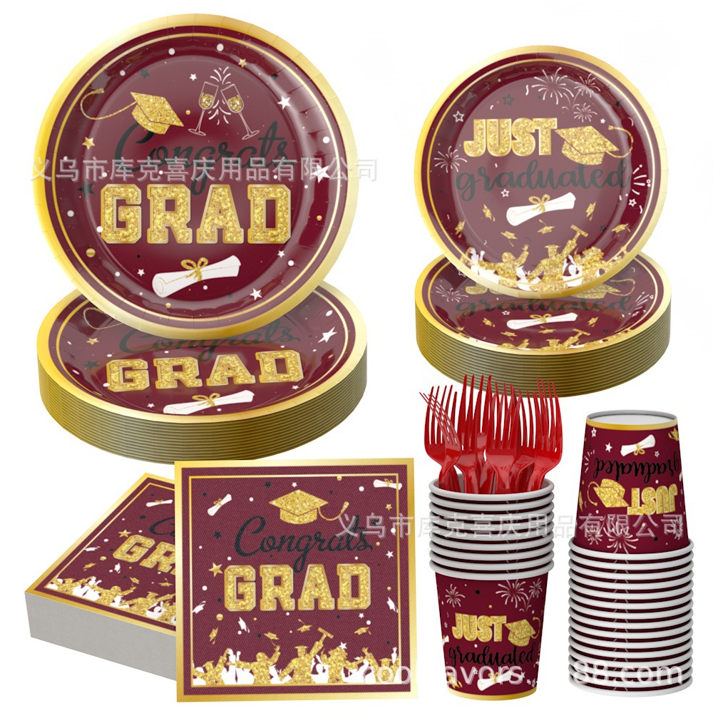Nueva temporada de graduación cubiertos de fiesta fiesta de graduación bandeja de papel desechable taza de papel toalla de papel conjunto de decoración de platos