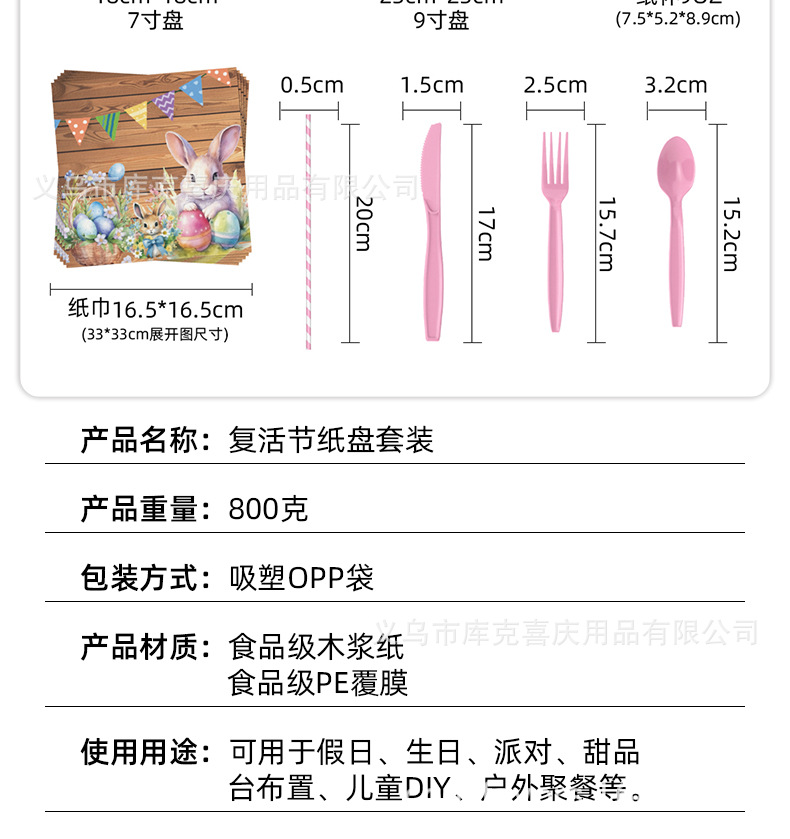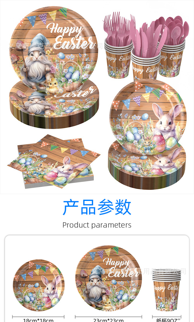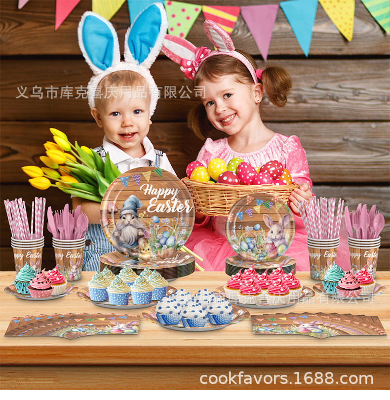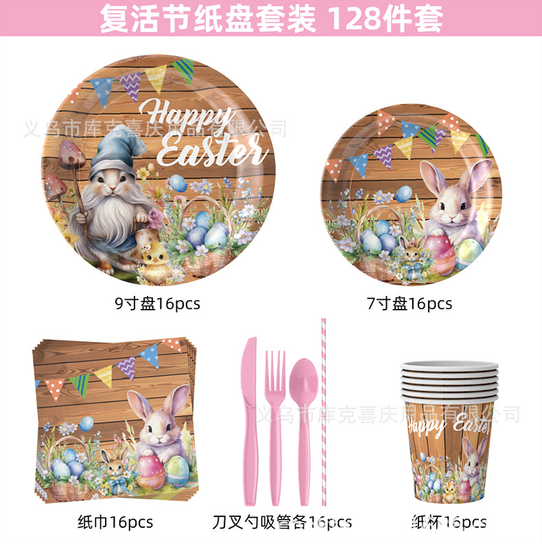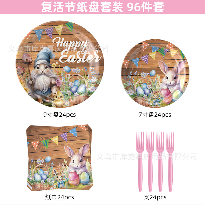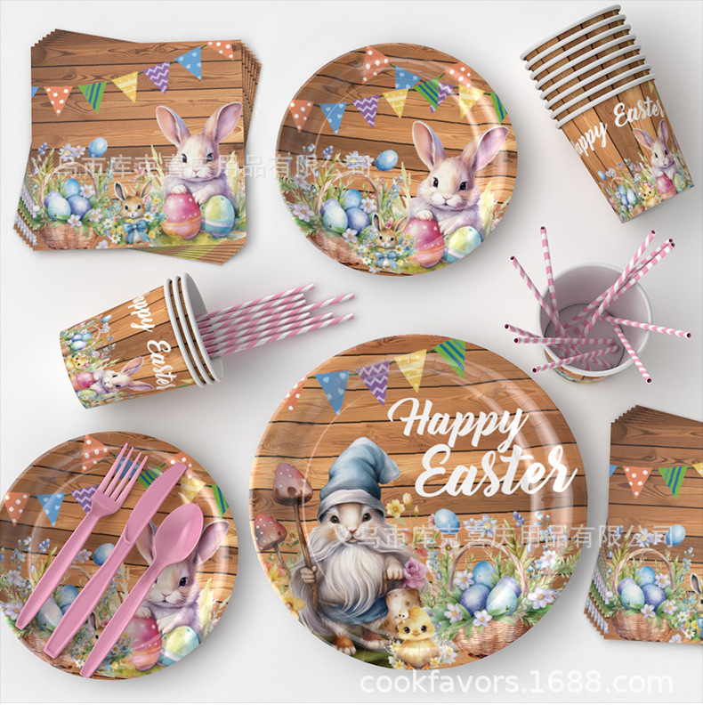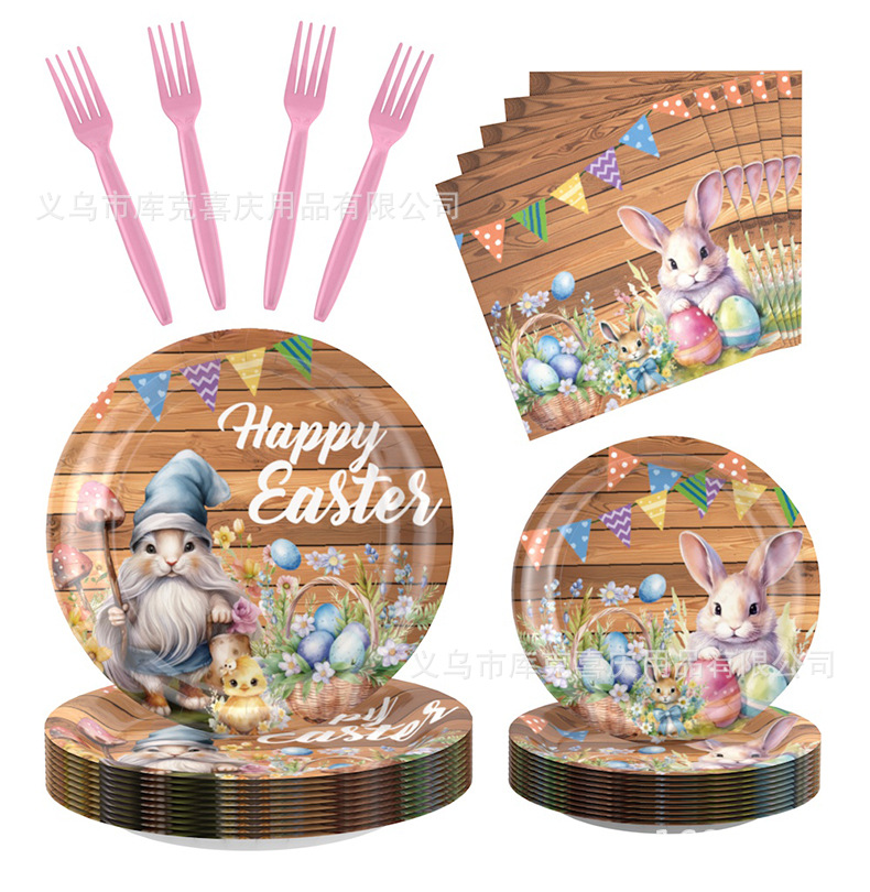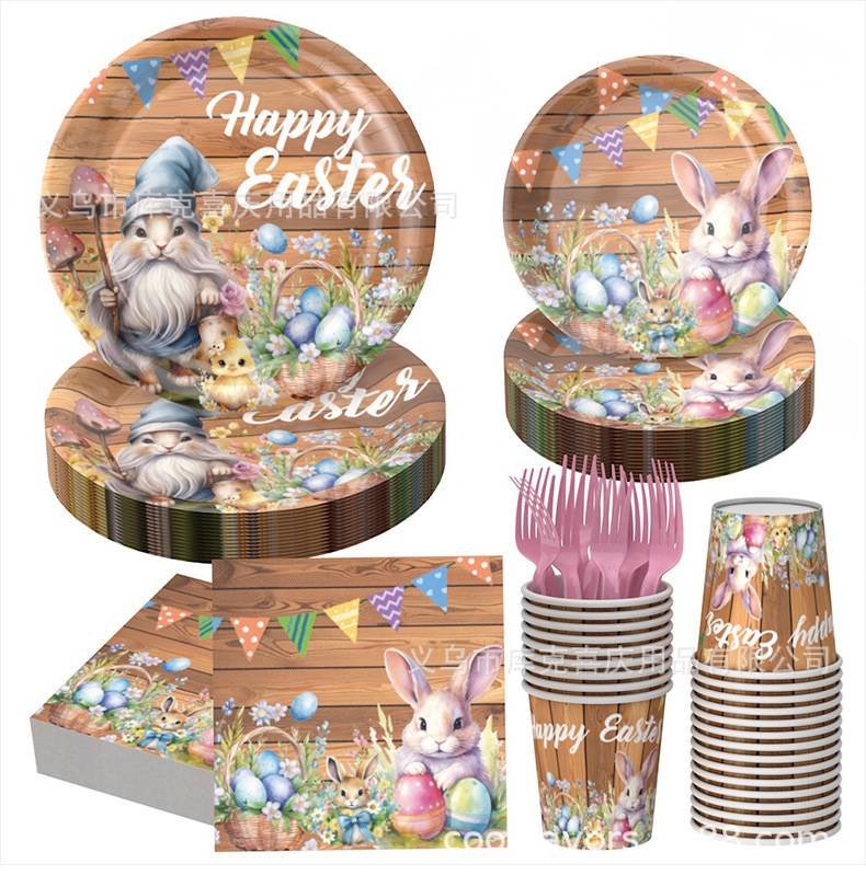 Conjunto de cubiertos de fiesta de Pascua de madera oscura transfronteriza huevo de conejo tema bandeja de papel desechable taza toallas de papel