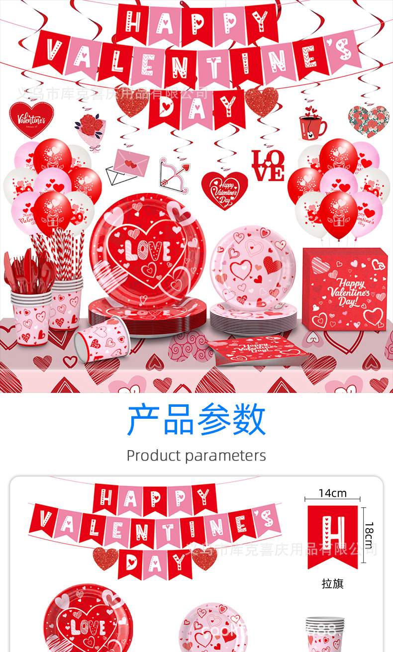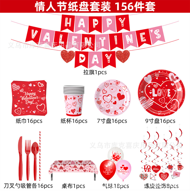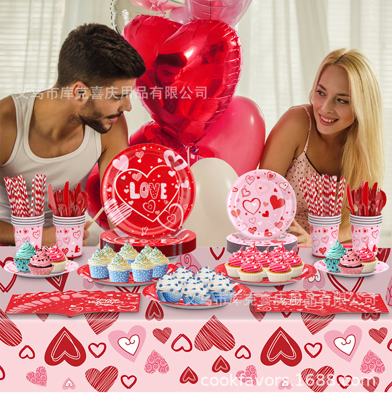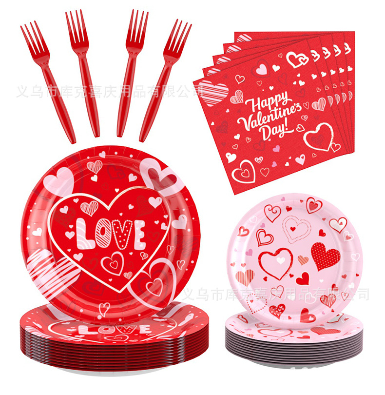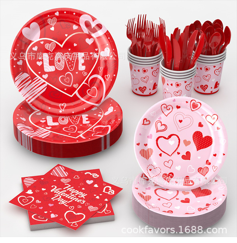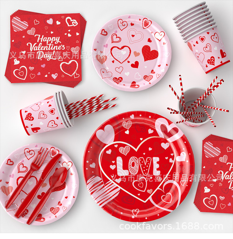 2025 Día de San Valentín decoración de la fiesta amor rojo bandeja de papel desechable taza de papel toalla set de cubiertos de fiesta