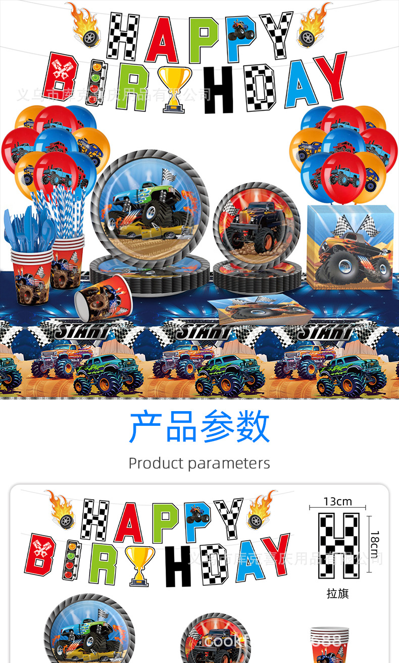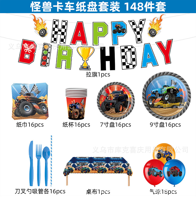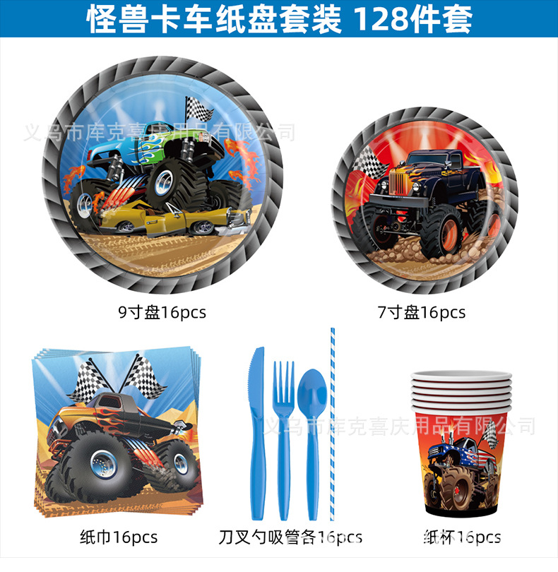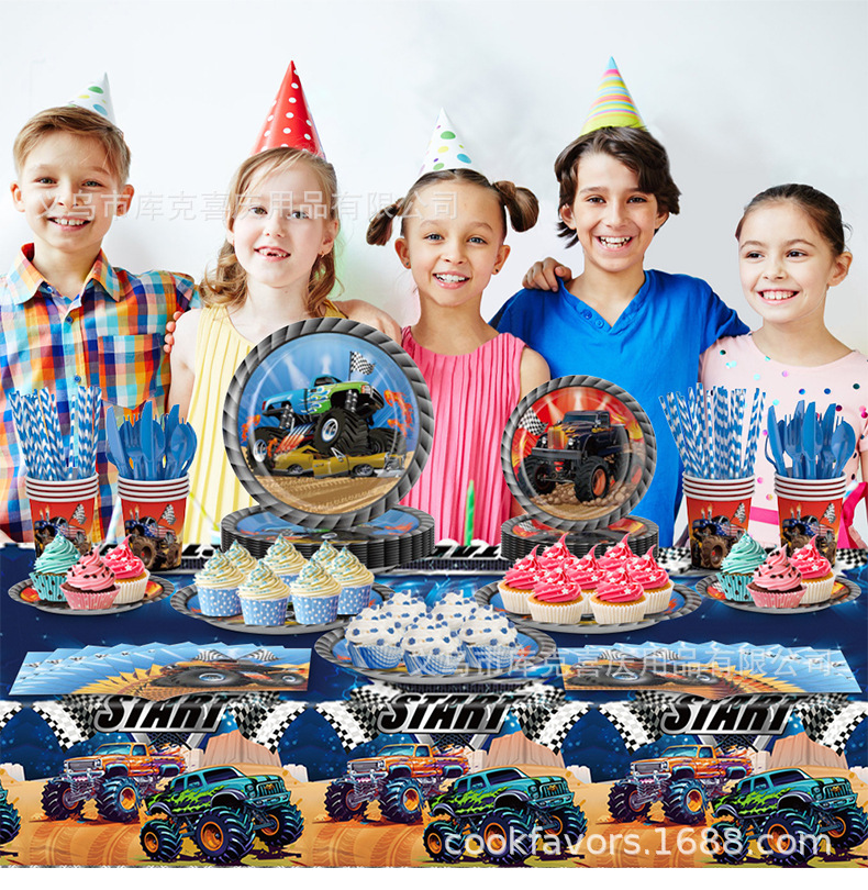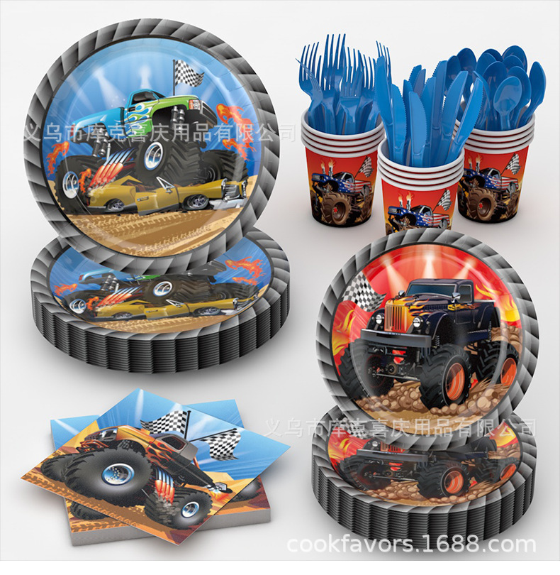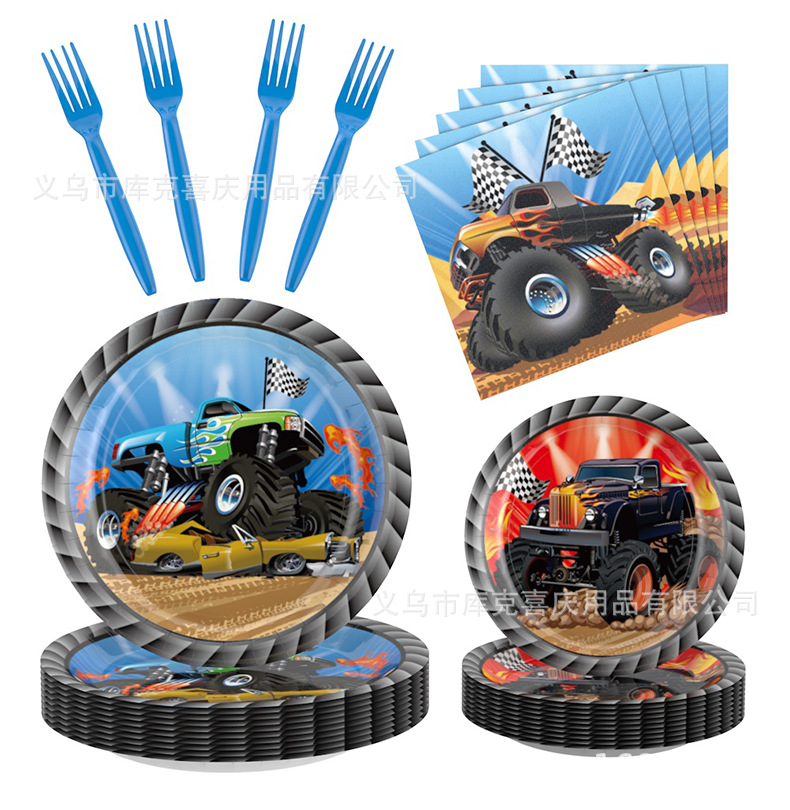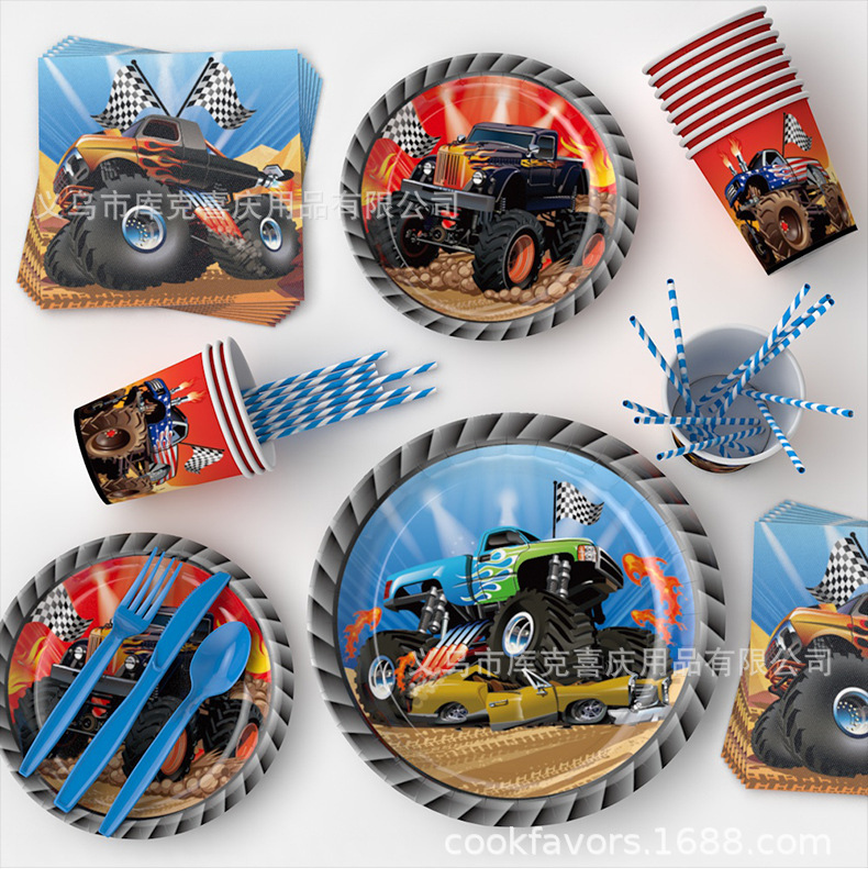 Camión cross-border tema de fiesta decoración niño cumpleaños bandeja de papel desechable tazas de papel toallas de papel set de cubiertos