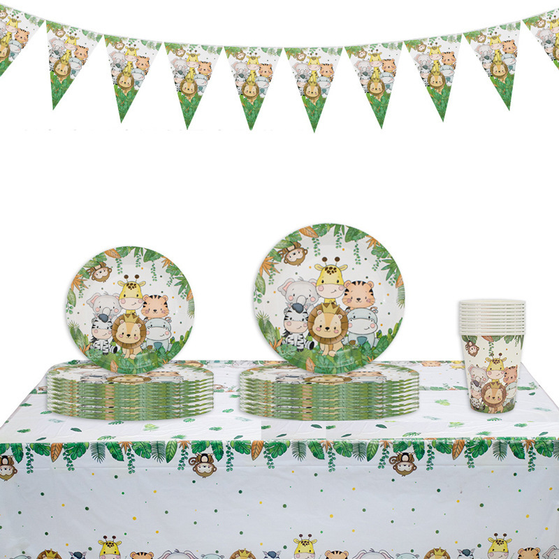 Segunda generación Forest Zoo fiesta de cumpleaños infantil suministros vajilla desechable taza de papel Placa de papel banner diseño traje