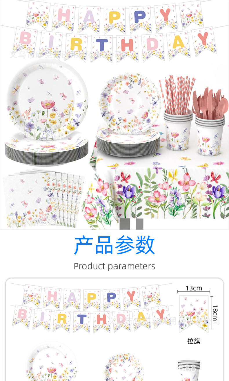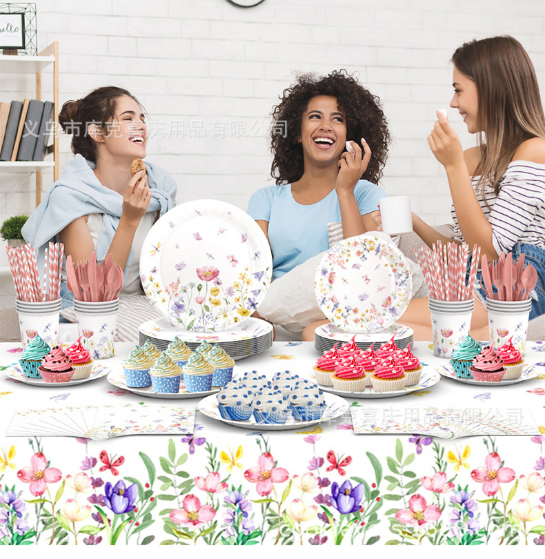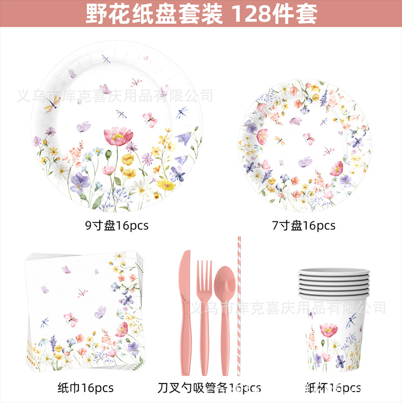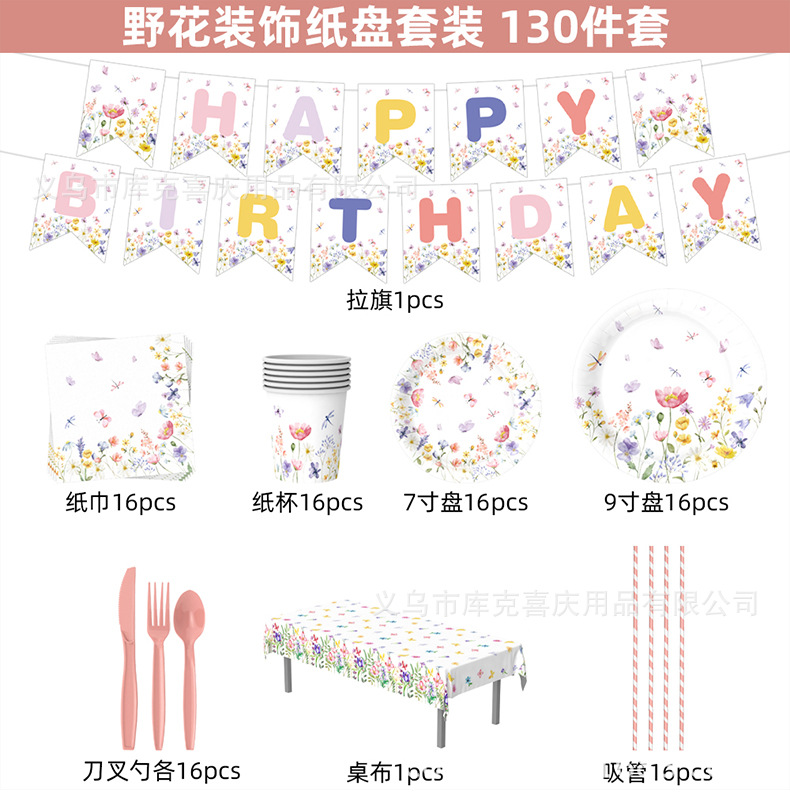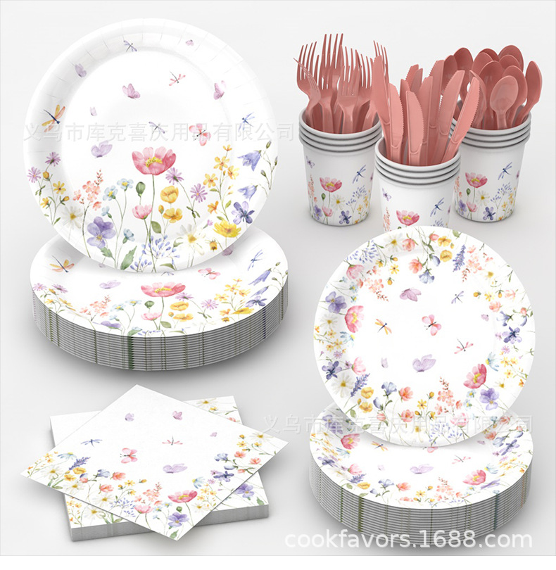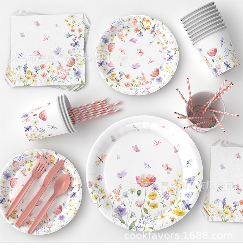 Nuevos platos de fiesta de flores silvestres cubiertos de fiesta de cumpleaños bandeja de papel desechable toallas de papel decoración de bandera