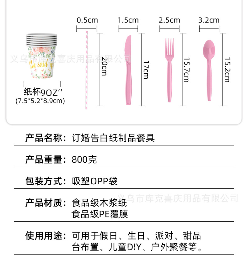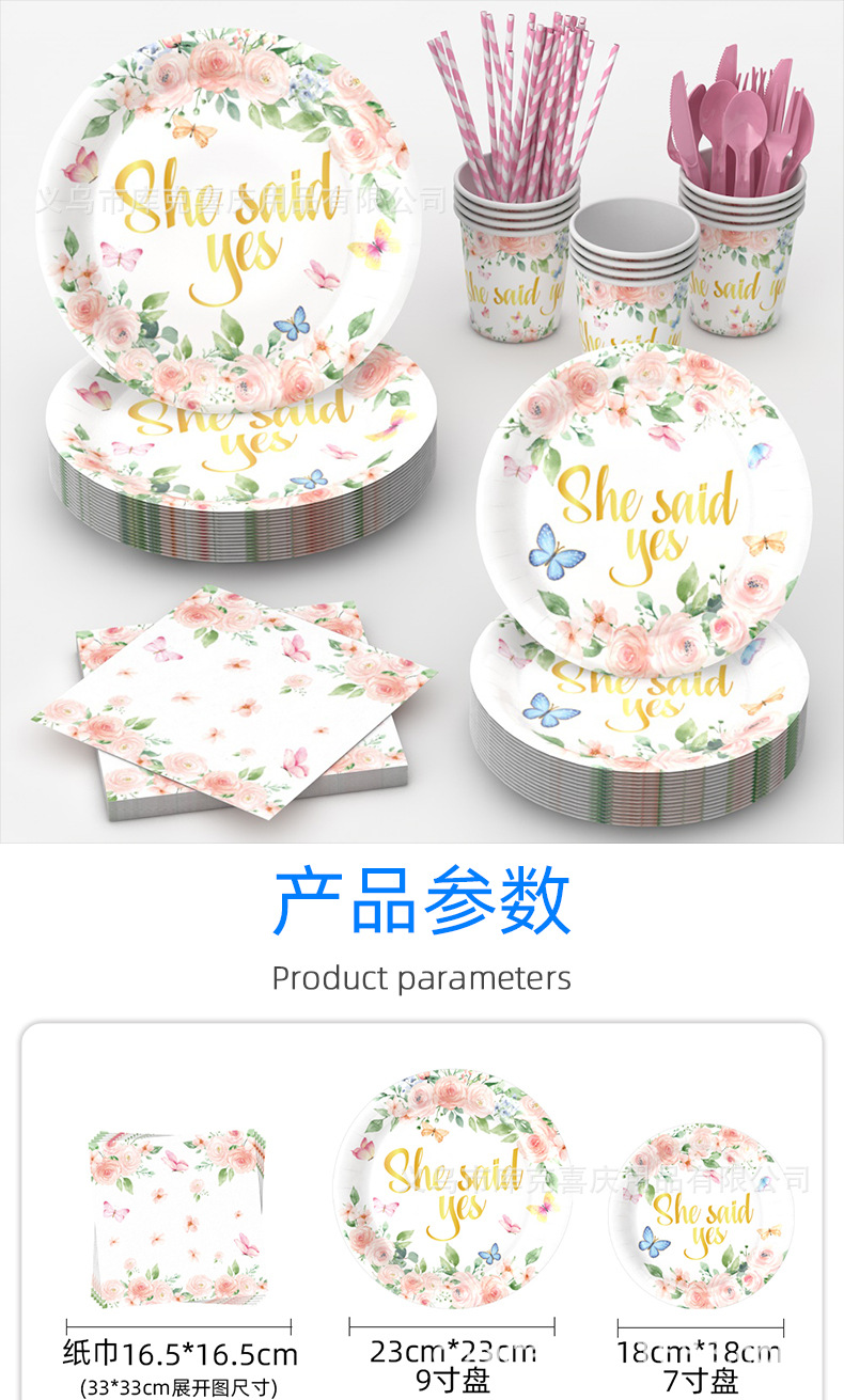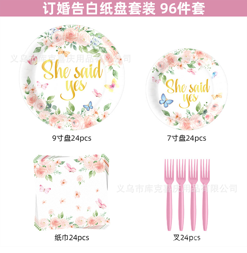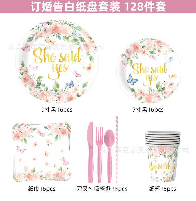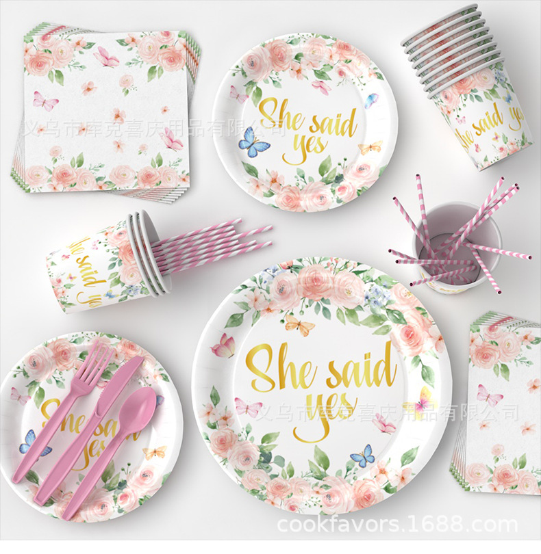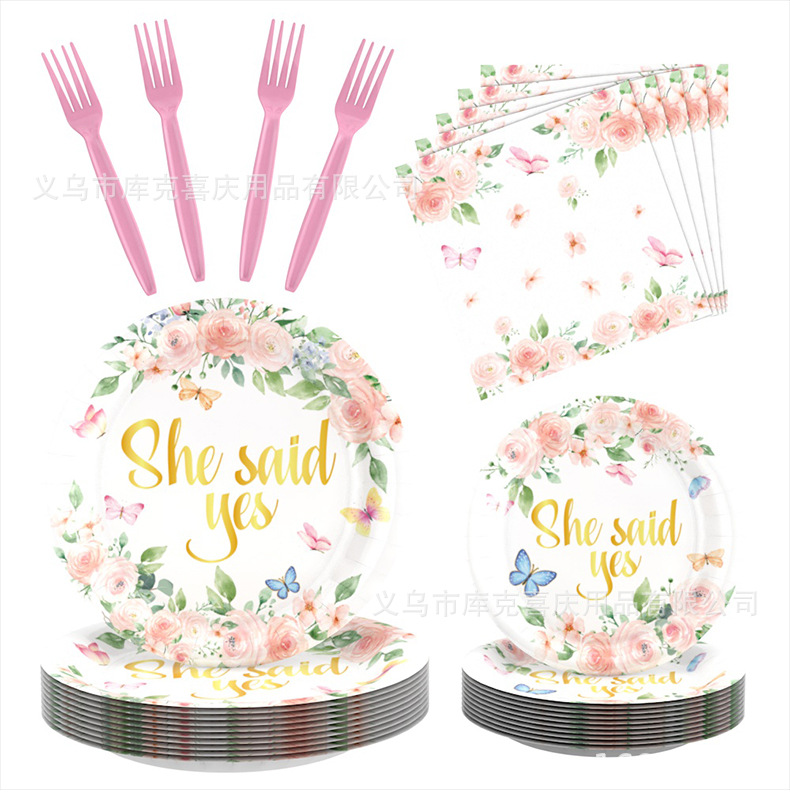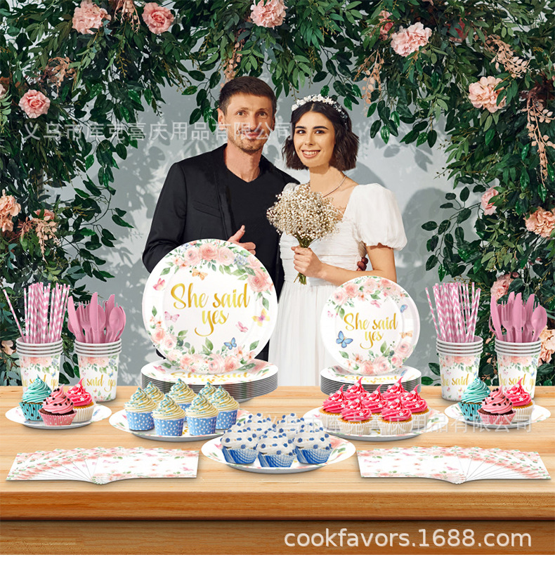 Conjunto de cubiertos de fiesta de compromiso de novia transfronterizos, bandeja de papel desechable, tazas de papel, toallas de papel cubiertos