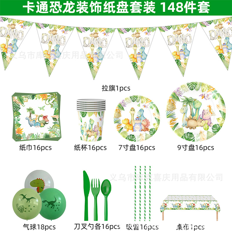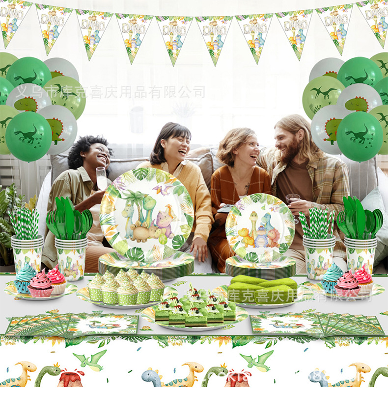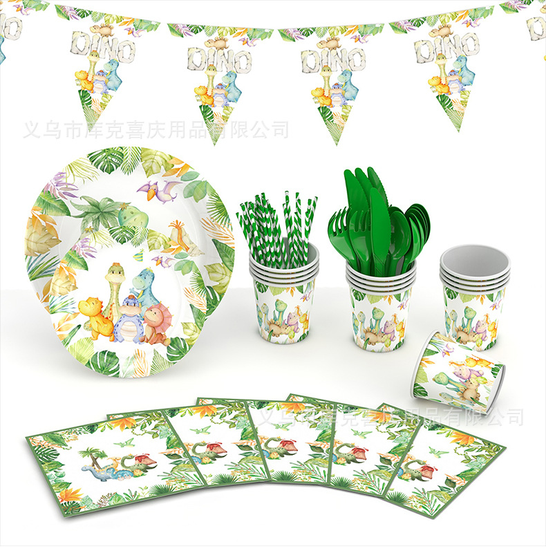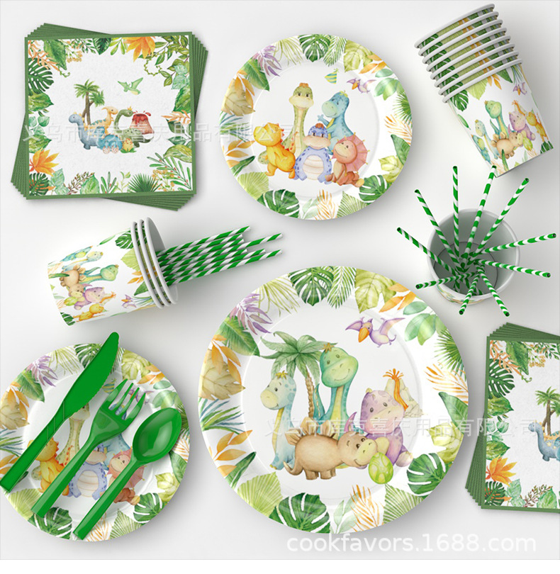 Venta caliente acuarela tema de dinosaurio juego de vajilla de fiesta para niños cumpleaños bandeja de papel taza de papel mantel suministros de decoración