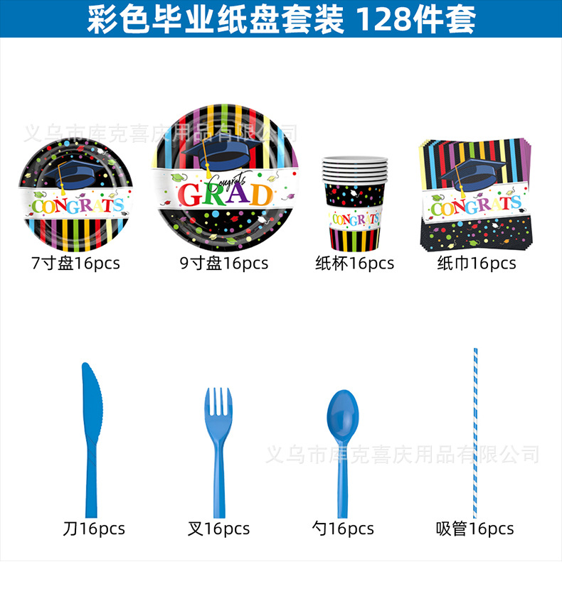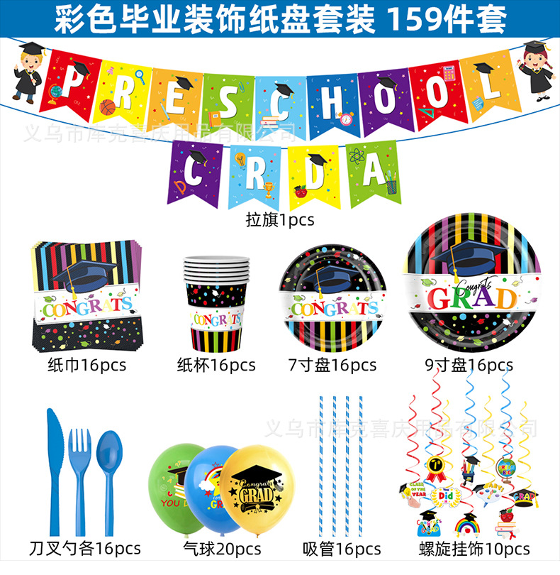 Nuevo jardín de infantes graduación ceremonia decoración diseño graduación temporada plato de papel taza de papel espiral tire bandera partido decoración traje
