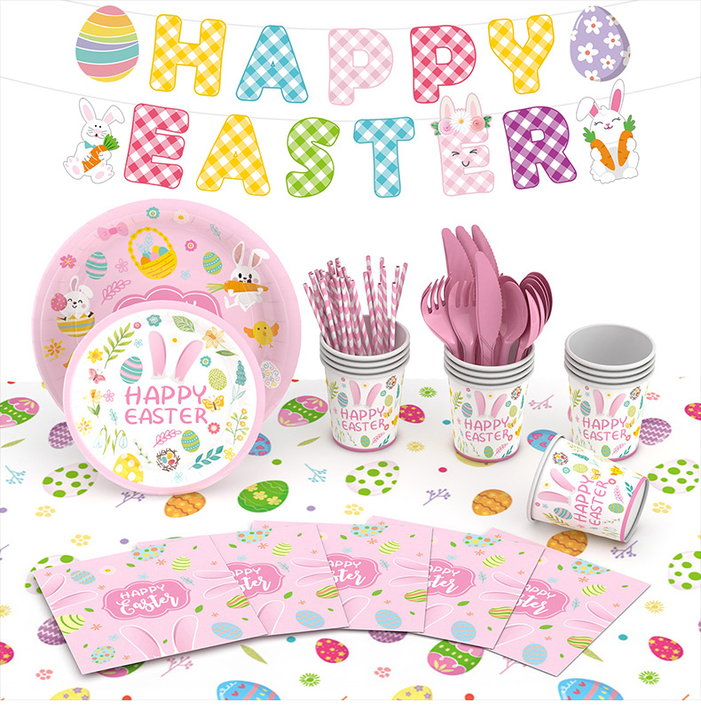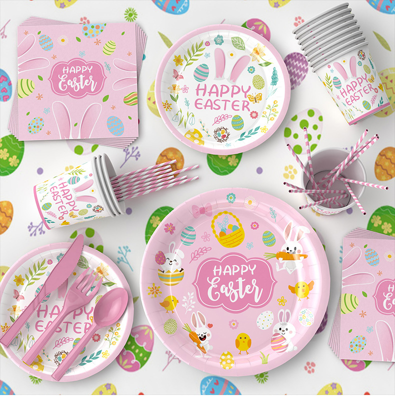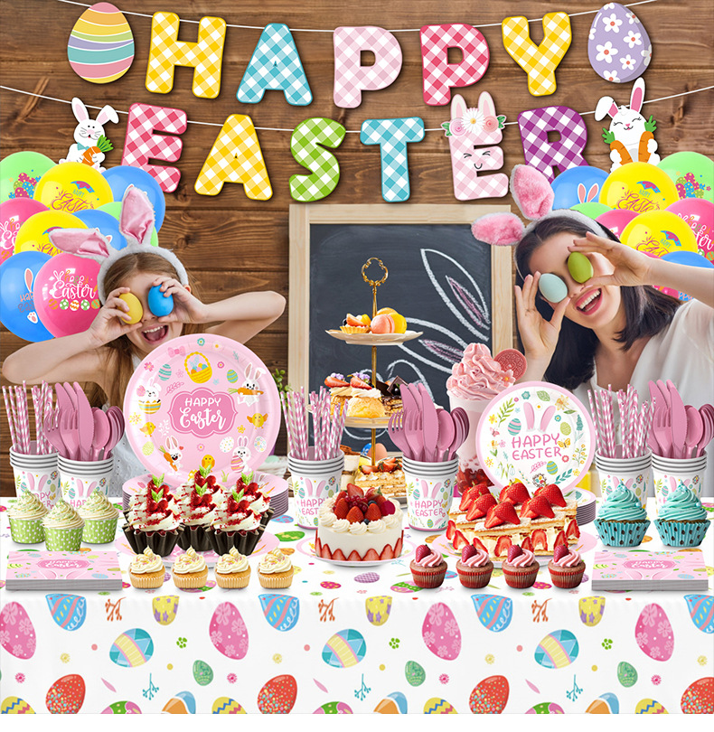 Nuevo TEMA DE Pascua fiesta Placa de papel decoración suministros conejo colorido huevo papel desechable taza mantel vajilla traje