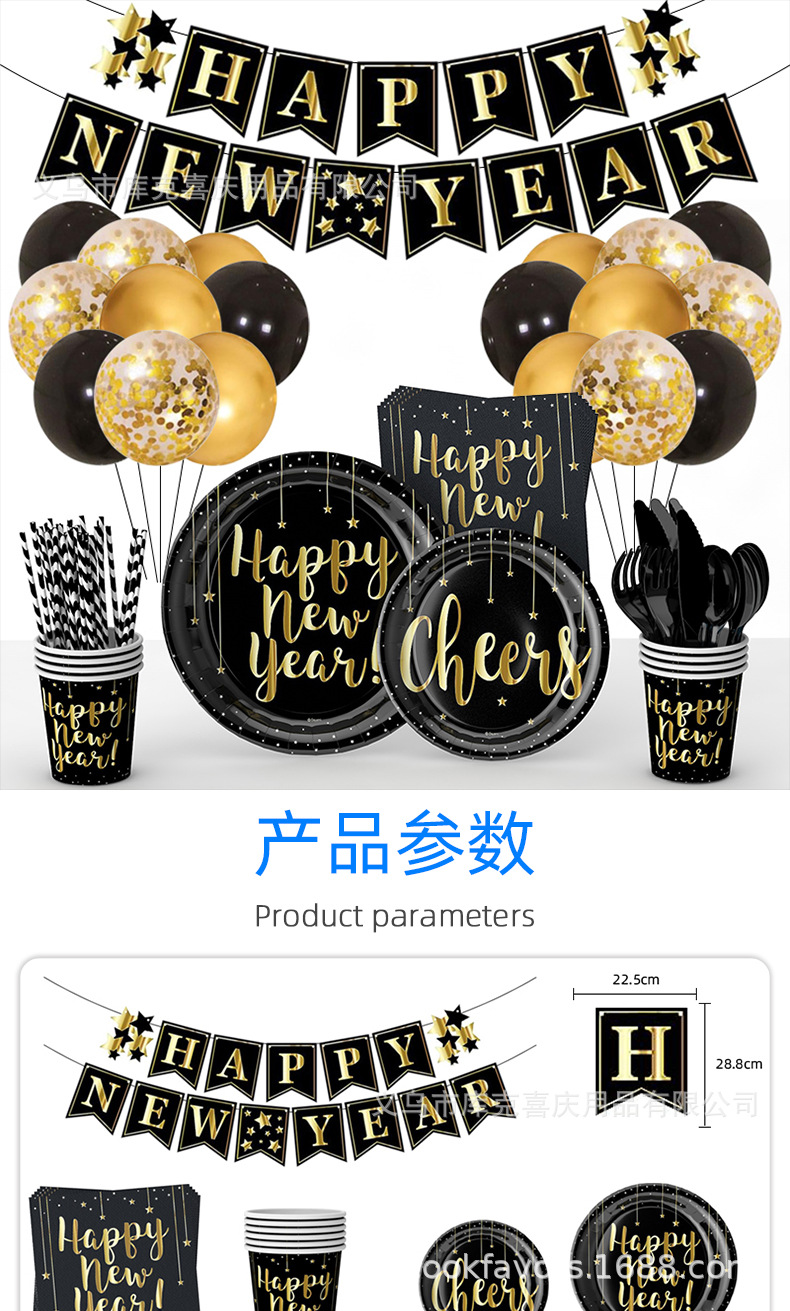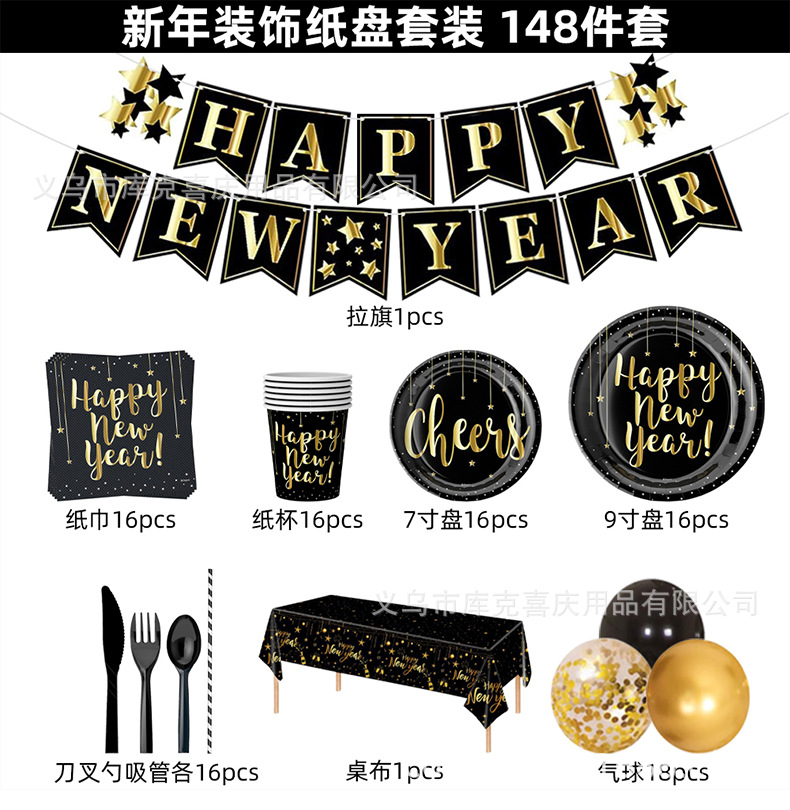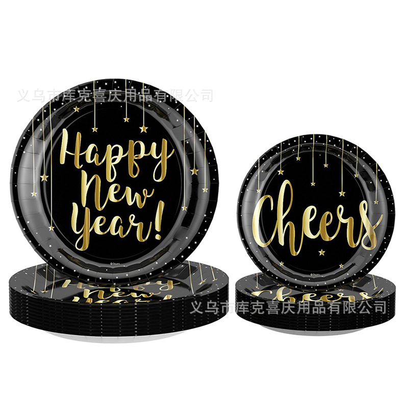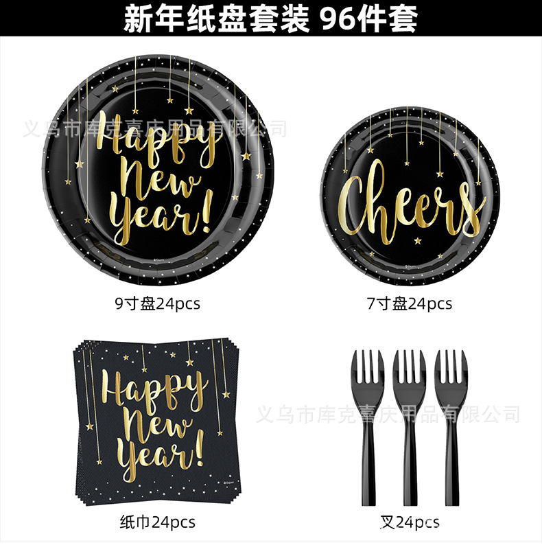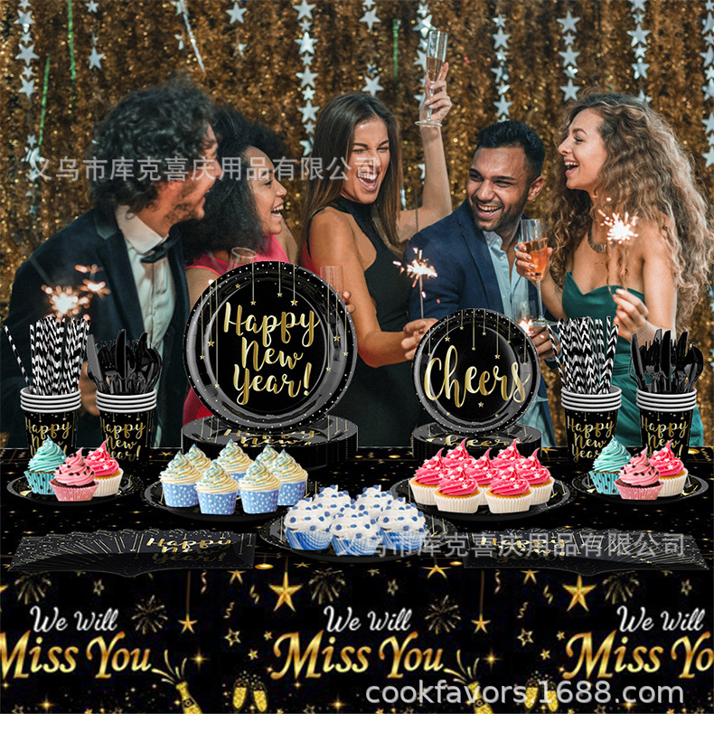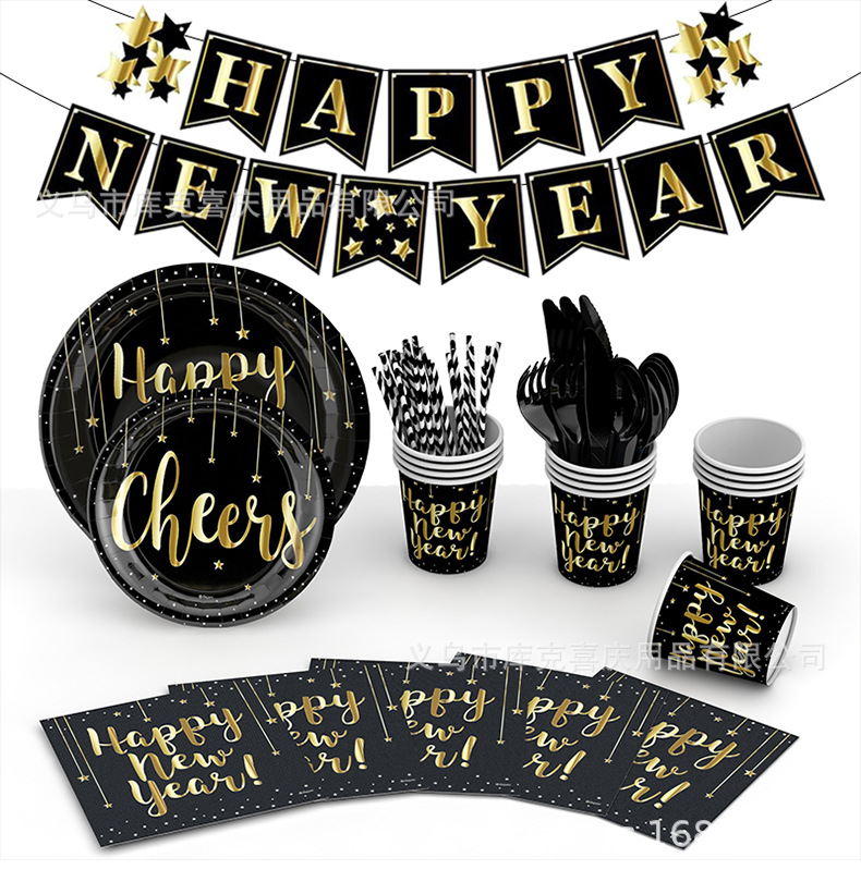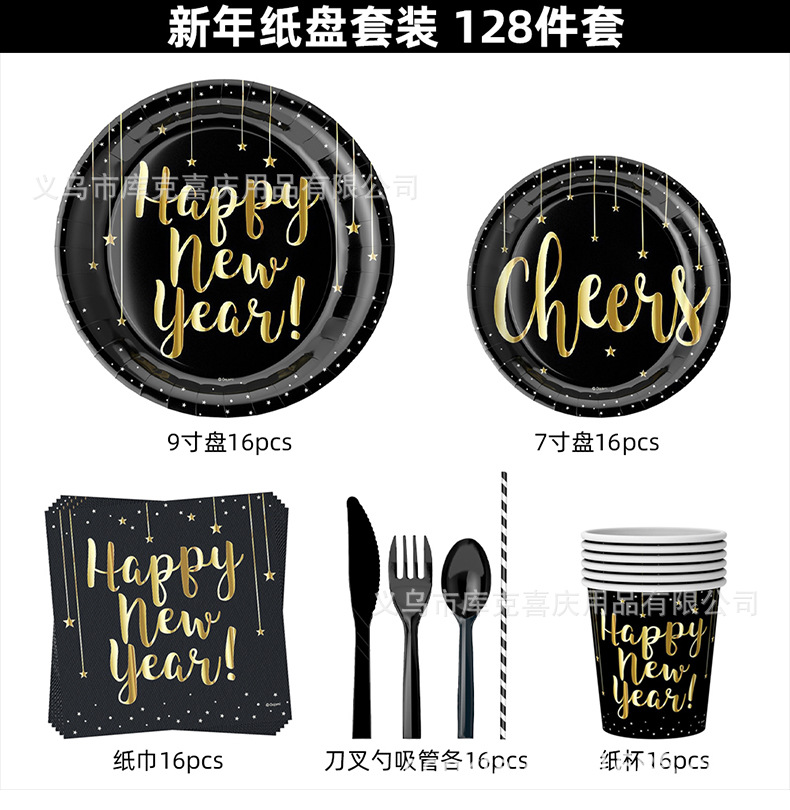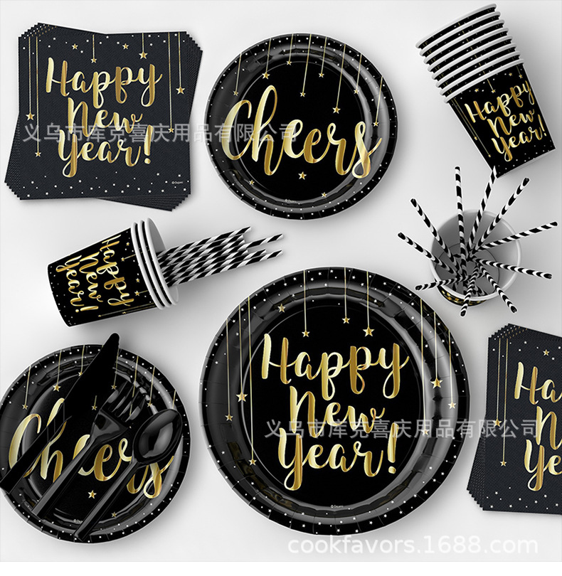 Tema de fiesta de AÑO NUEVO transfronterizo FELIZ AÑO NUEVO bandeja de papel desechable taza de papel 2024 traje de fiesta de AÑO NUEVO