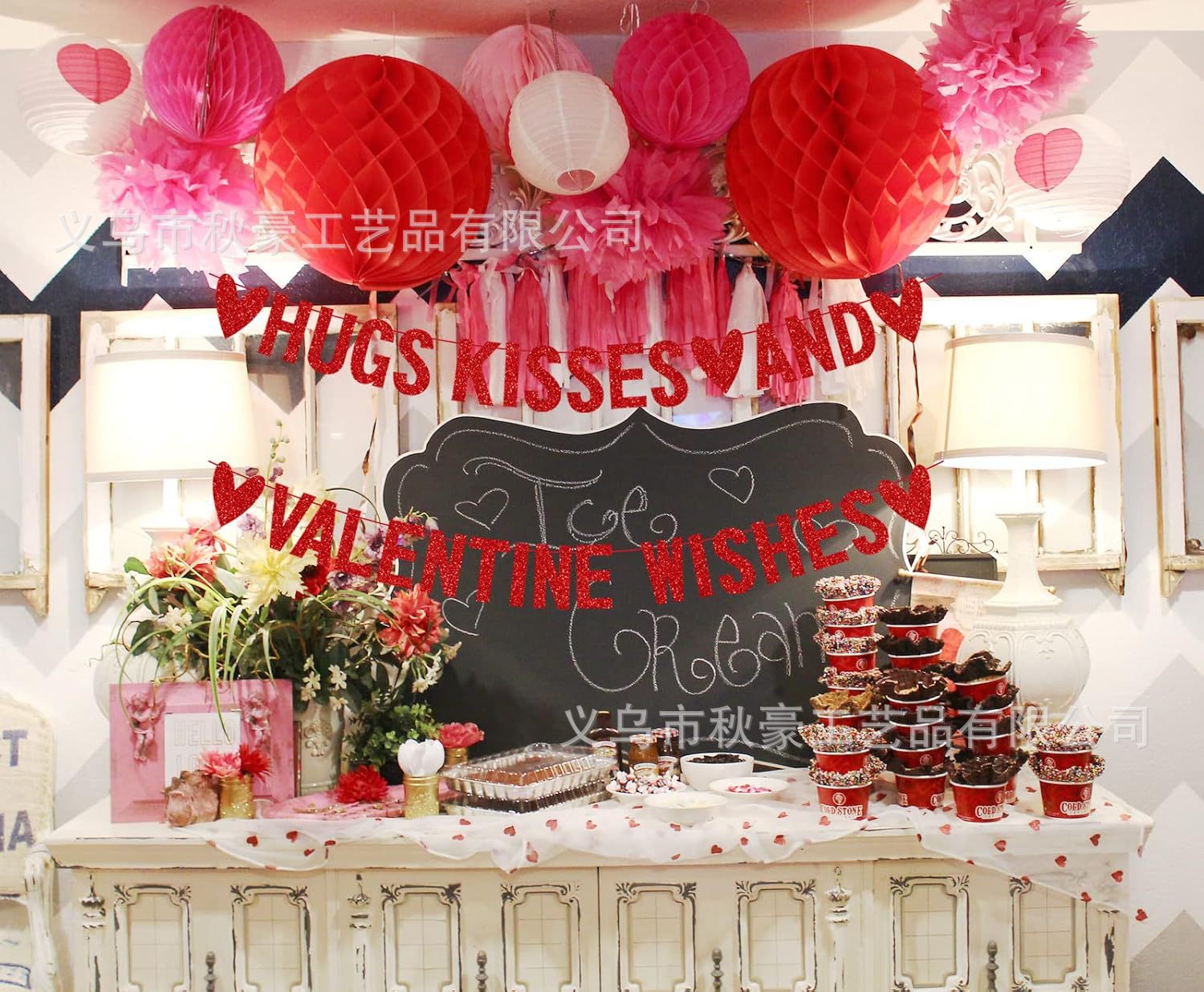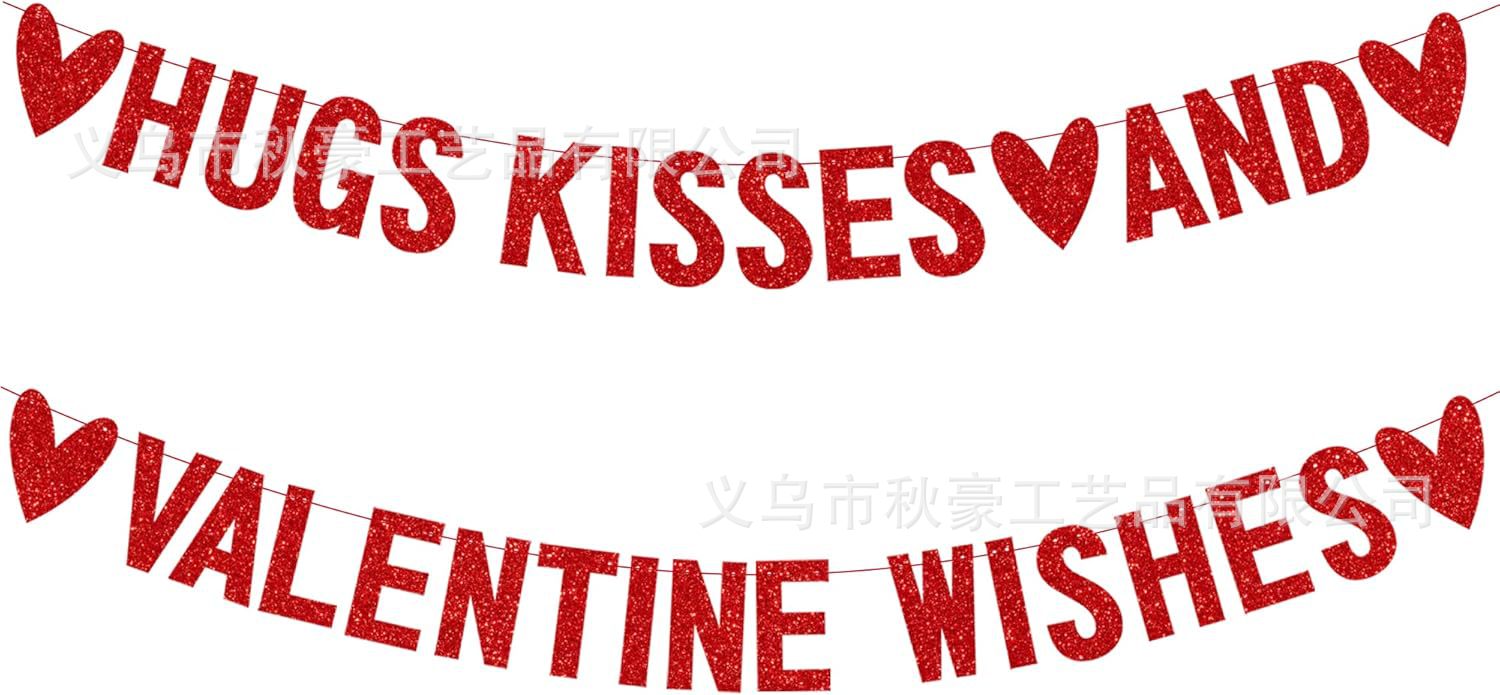 Feliz Día de San Valentín tira de banderas abrazar besos y bendiciones del Día de San Valentín tira de flores polvo decoración de fiesta