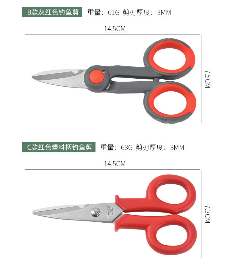 | Color | Tijeras de pesca naranjas y grises a, tijeras de pesca grises y rojas B y tijeras de pesca con mango de plástico rojo C |