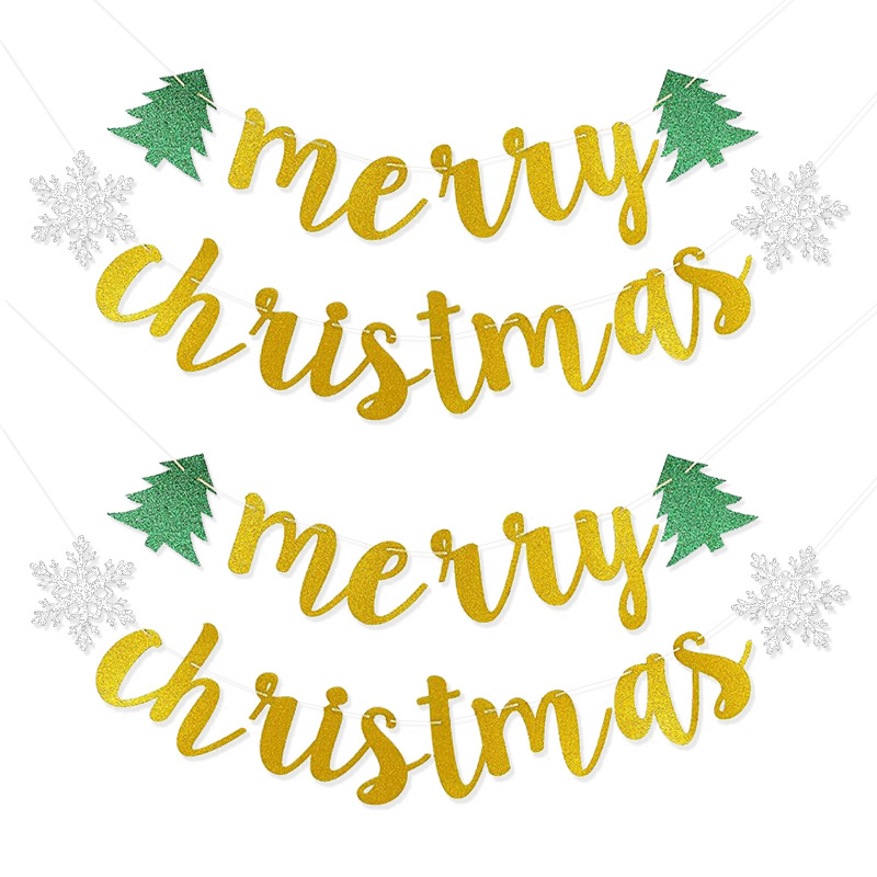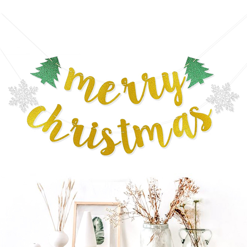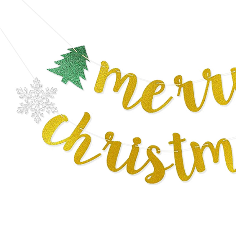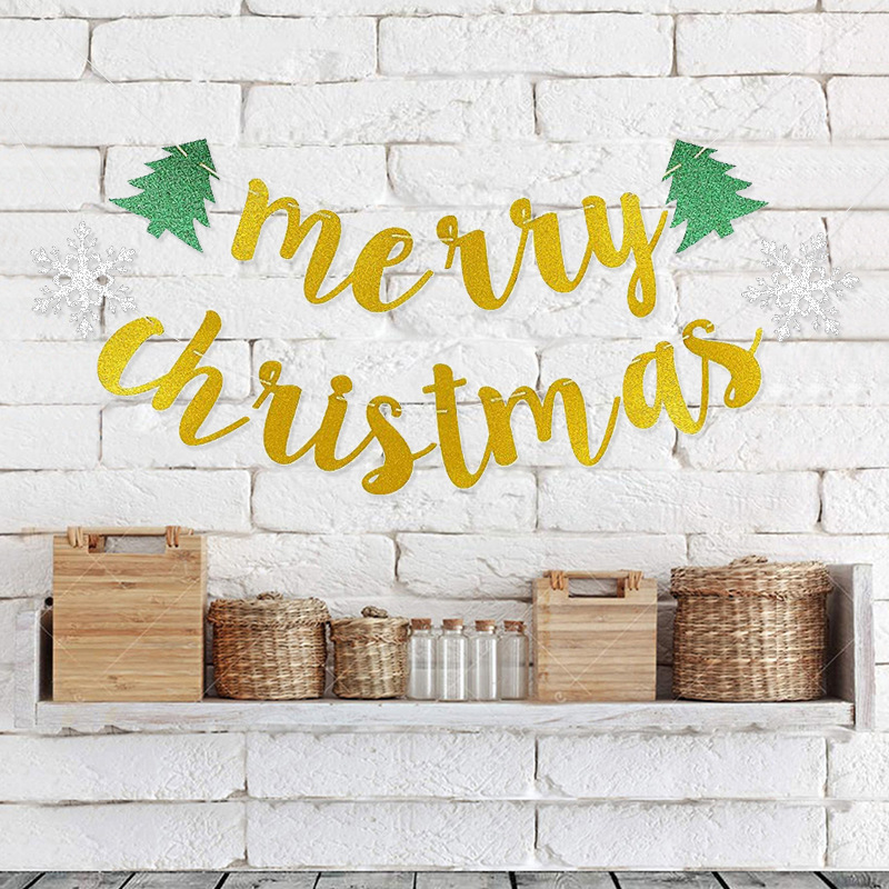 Decoración del árbol de Navidad, bandera de nieve de Navidad, polvo brillante, flores, cartas de Feliz Navidad colgadas