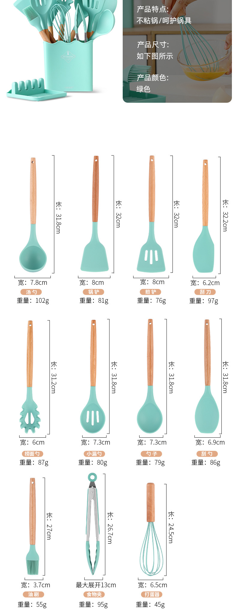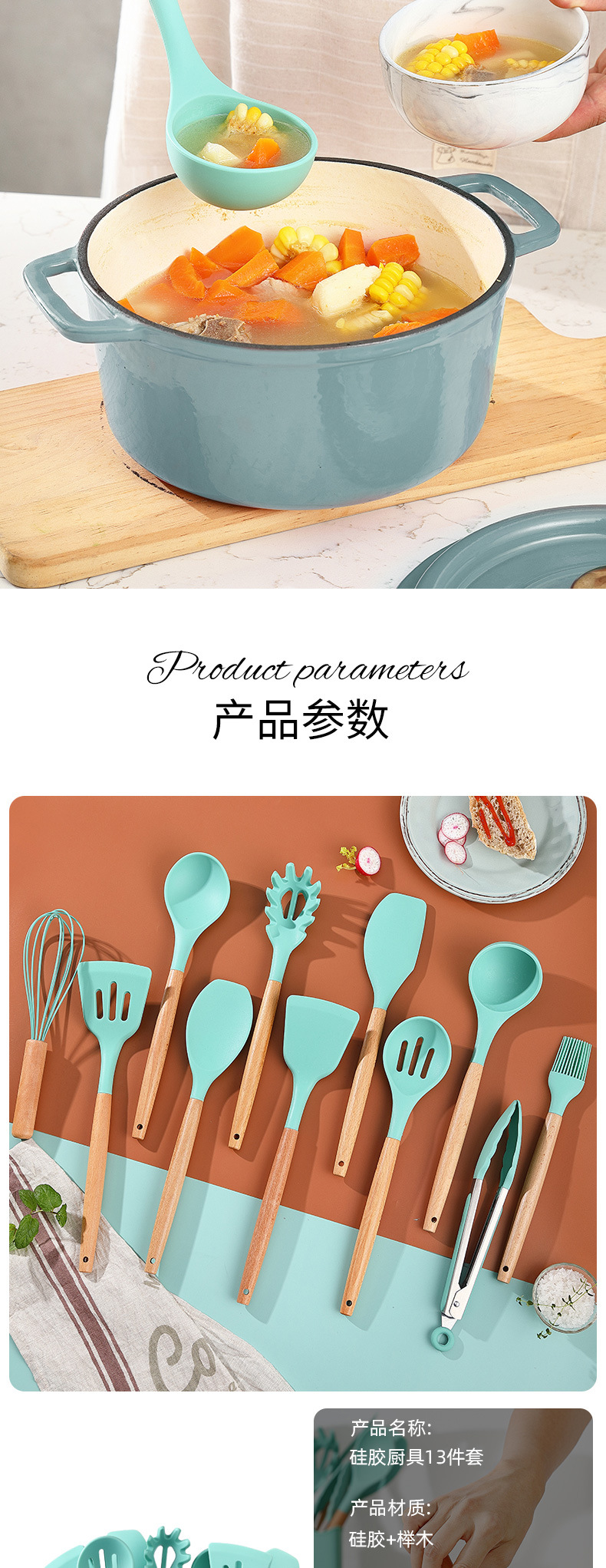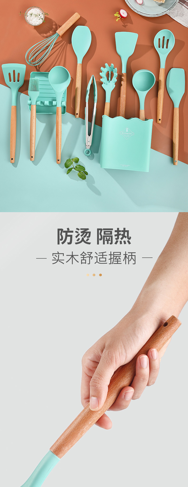 Venta caliente transfronteriza juego de utensilios de cocina de silicona creativa mango de madera con cubo 13 piezas de silicona espátula cuchara herramientas de cocina de silicona