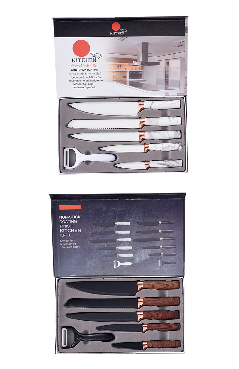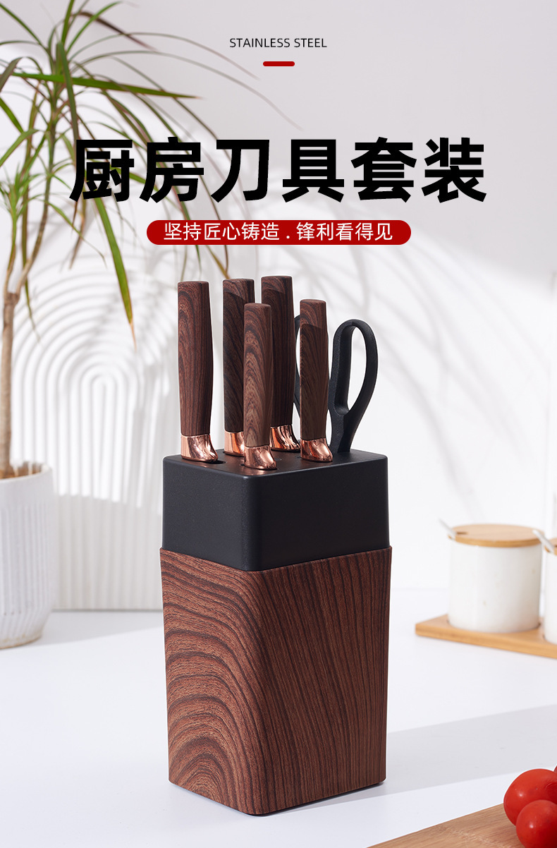 Conjunto de cuchillos antiadherente transfronterizo con patrón de diamante negro y cómodos con patrón de madera siete piezas con cuchillos de regalo cuchillo de cocina doméstico en stock