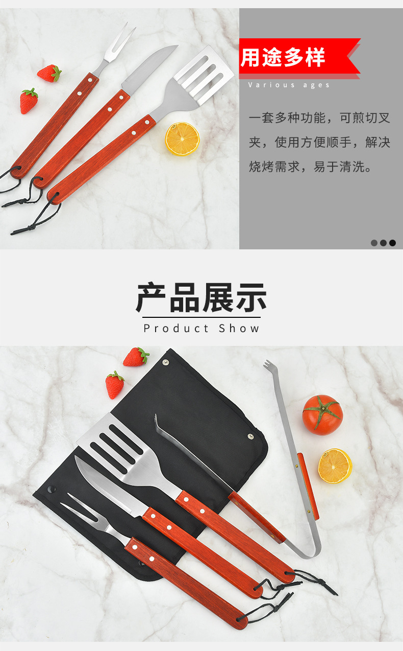 Ventas directas de mano de madera BBQ BBQ conjunto de parrilla clips de parrilla tenedor cuchilla delantal Oxford bolsa de tela parrilla set de cinco piezas