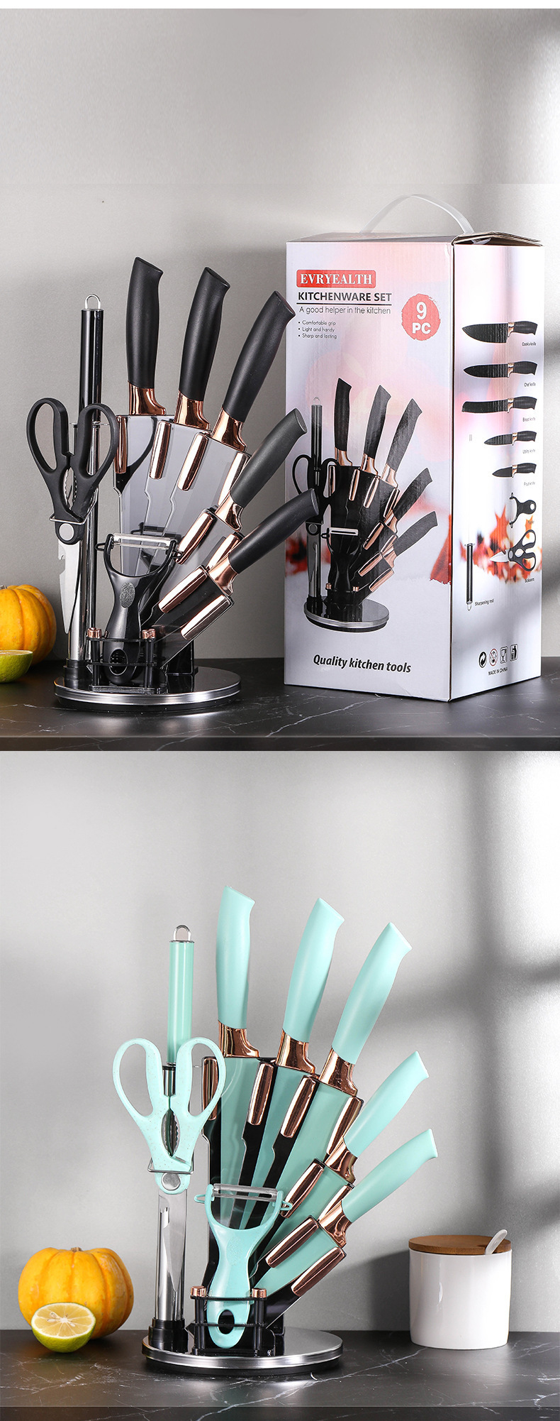 Cabezal de galvanoplastia de acero inoxidable con soporte para cuchillos, cuchillo de cocina, asiento giratorio, cuchillo de cocina, juego de regalo, cuchillo de cocina de 9 piezas