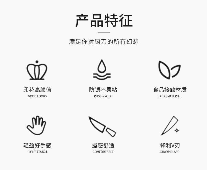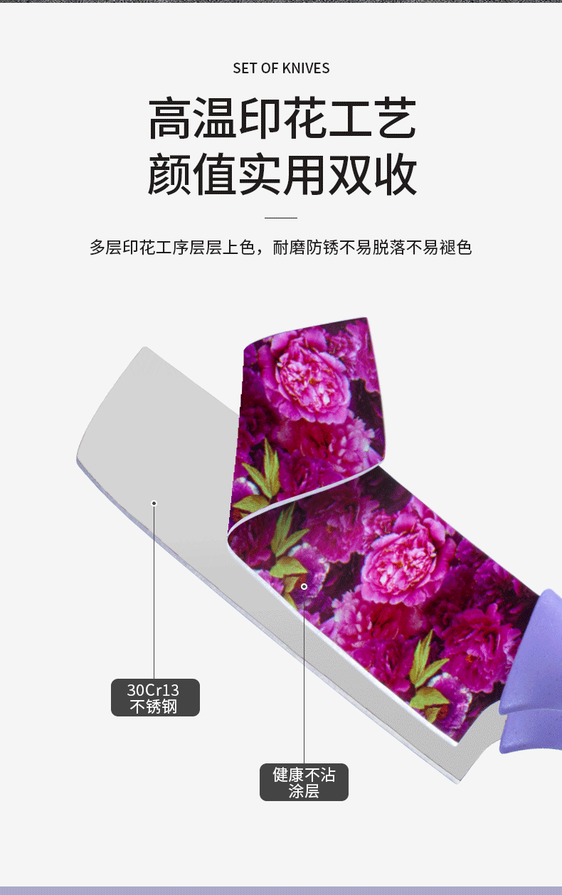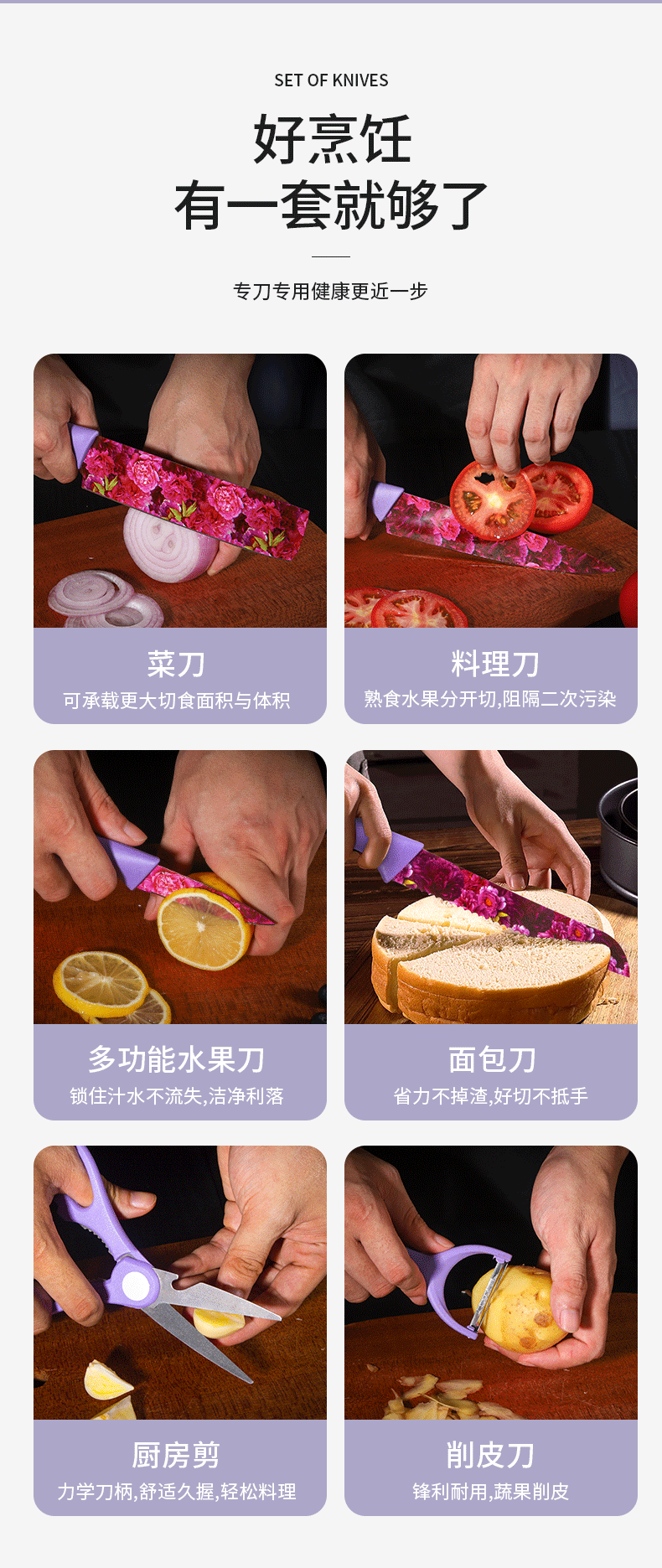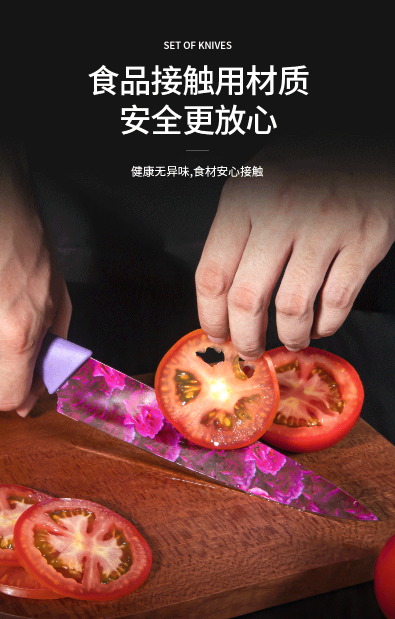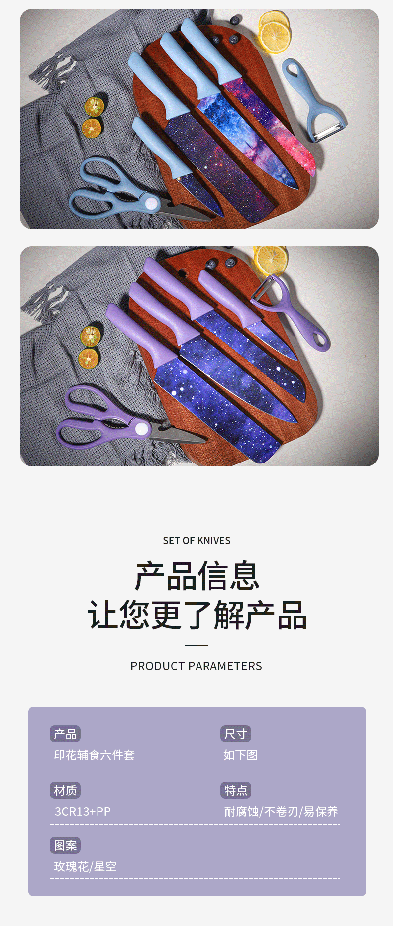 Juego de cuchillos de cocina Juego de 6 piezas de paja de trigo con estampado en color de acero inoxidable Juego de cuchillos de complementos alimenticios de cocina para el hogar al por mayor