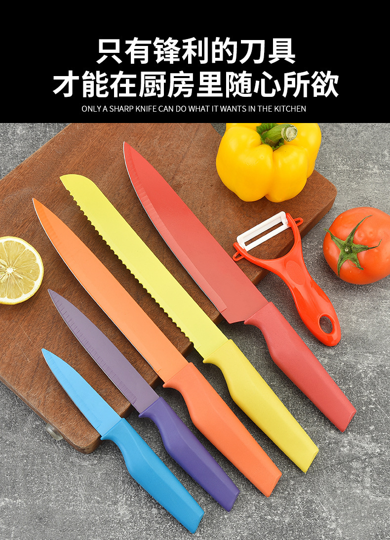 Cuchillo de chef de cocina Cuchillo de pan Cuchillo de frutas Cuchillo de melón Juego de seis piezas Cortar verduras y carne Juego de cuchillos con mango de caballito de mar colorido
