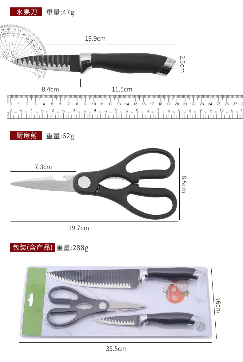 Spot Factory Venta caliente Juego de cuchillos de tres piezas con patrón de ondas negras Cuchillo de frutas Cuchillo de chef Juego de tijeras de cocina
